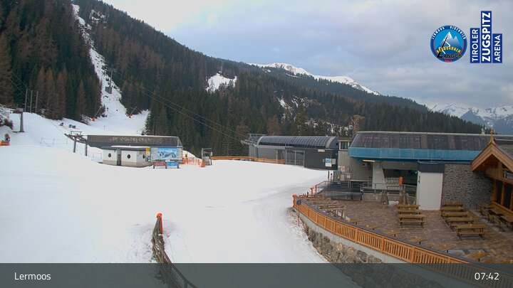 Die Webcam befindet sich an der Bergstation des Hochmoos Express in Lermoos und blickt auf die umliegenden Alpen.