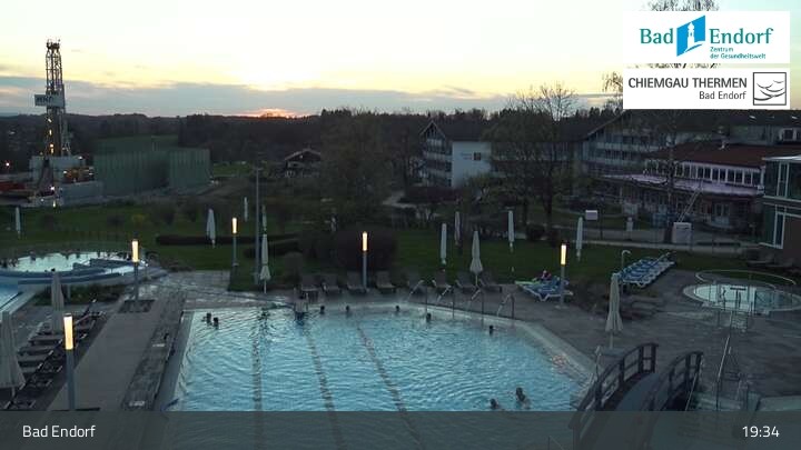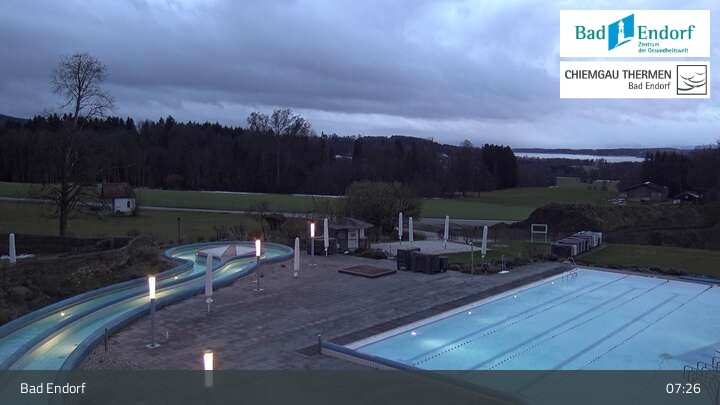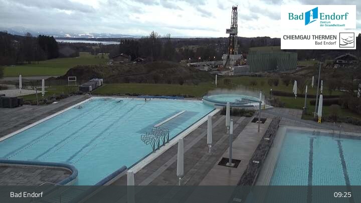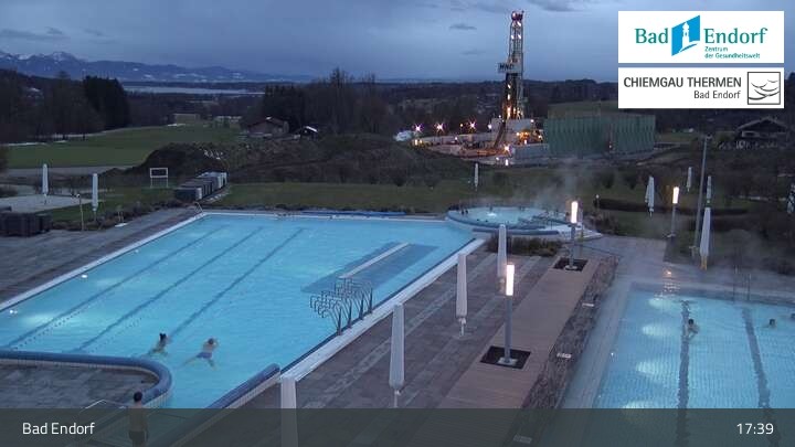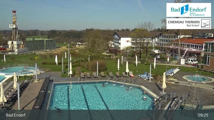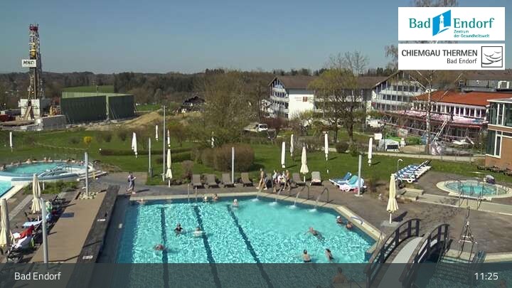 Die Webcam bietet einen Blick das Außengelände der Chiemgau Therme in Bad Endorf. Zu sehen ist unter anderem auch der 125 Meter lange Strömungskanal, ein Highlight der Therme im Landkreis Rosenheim.