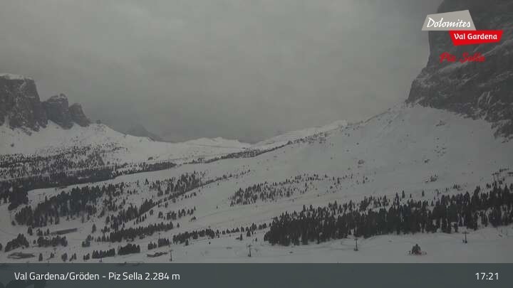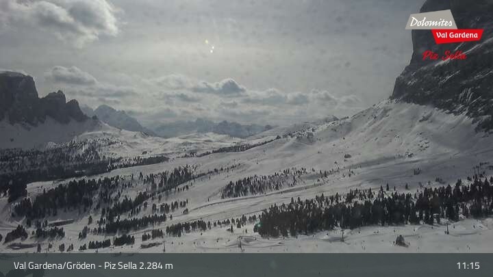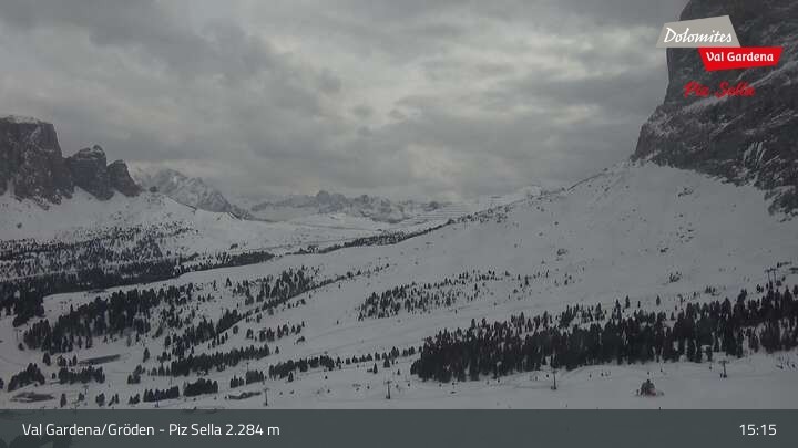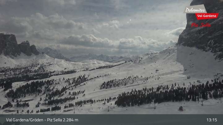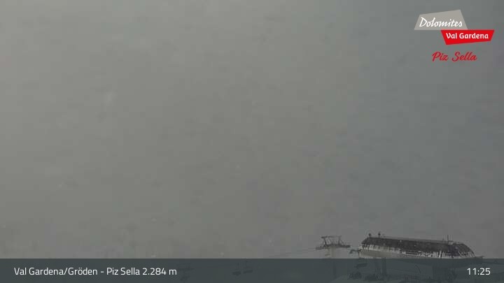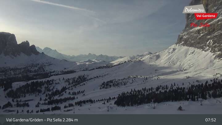 Ausblick von der Bergstation am Piz Sella in Val Gardena in Südirol. Zu sehen sind u.a. der Langkofel und die Sellagrupee.