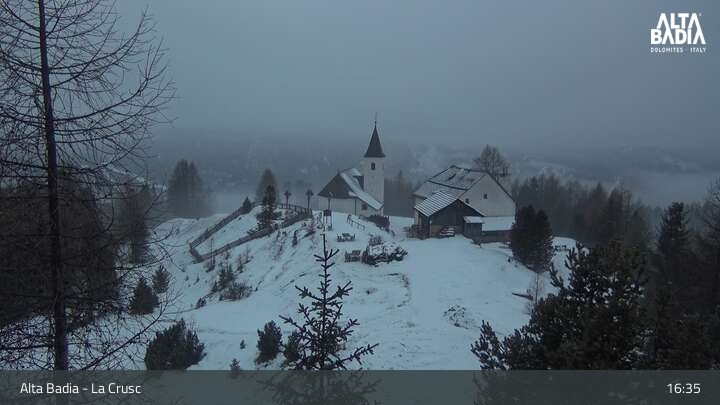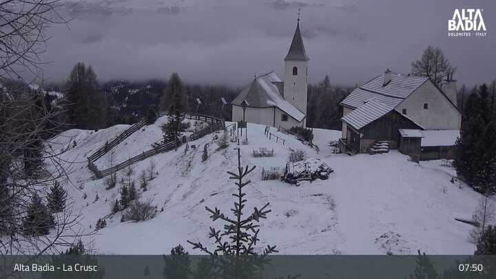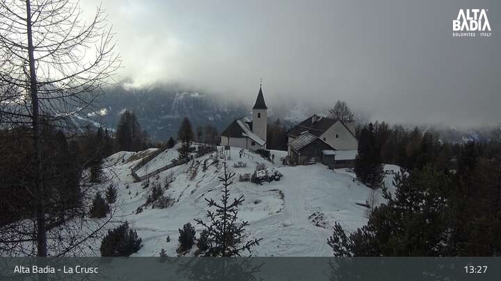 Blick von der Bergstation des La Crusc Sessellifts auf die Berge rund um Alta Badia. Die kleine Kirche ist ein beliebtes Wallfahrtsziel.