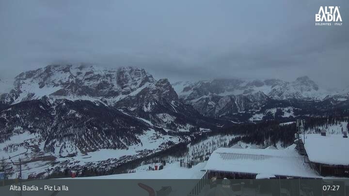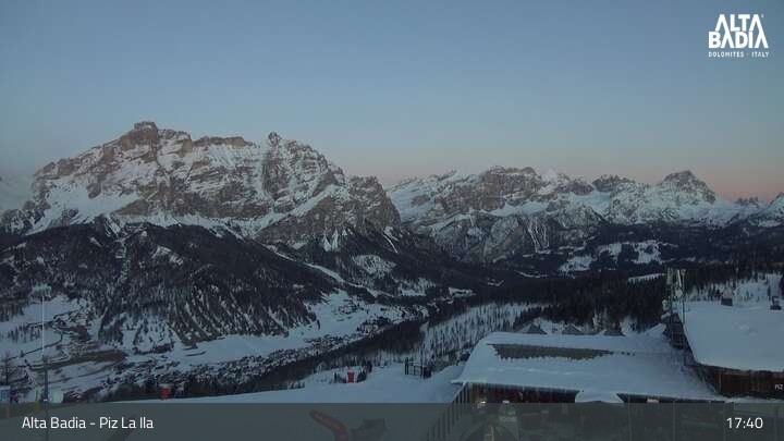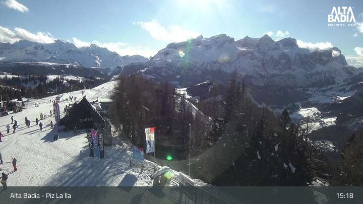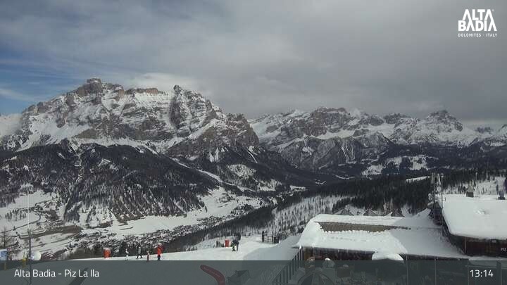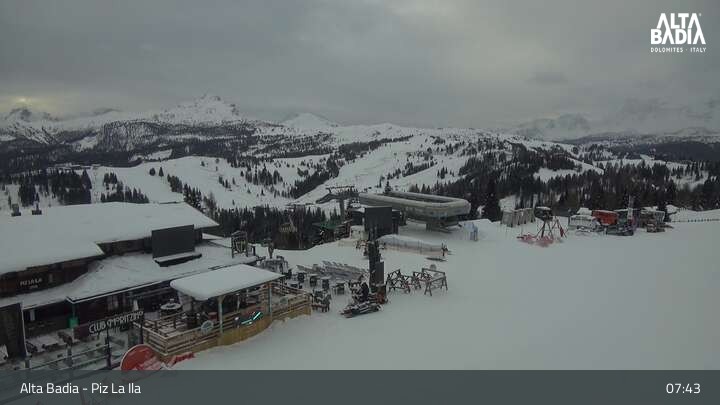 Zu sehen ist die Bergstation des Sessellifts Bamby am Piz La Ila mit Blick zum Marmolada Gletscher