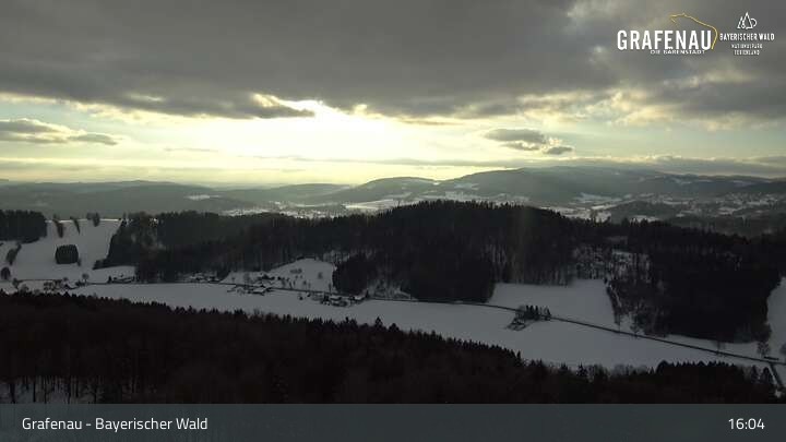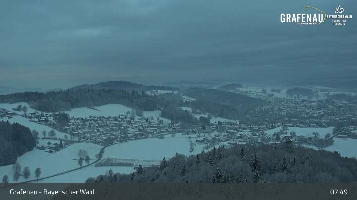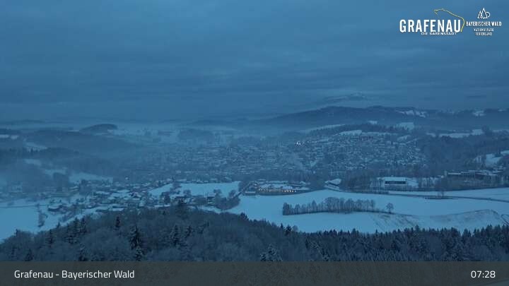 Genieße den Ausblick auf den Luftkurort Grafenau im Bayerischen Wald. Die Kamera befindet sich südlich der Stadt und blickt nach Norden über die Stadt zum Nationalpark Bayerischer Wald.