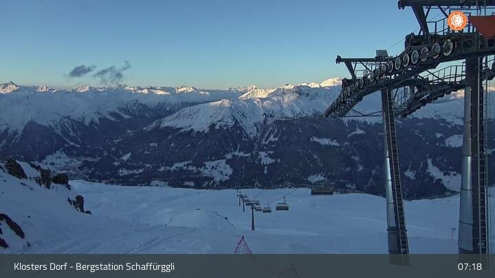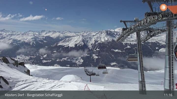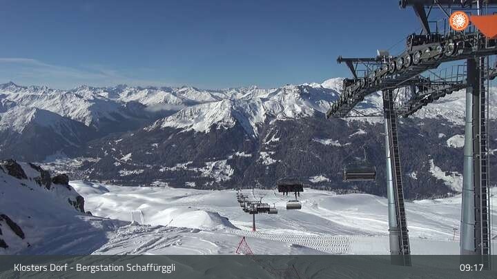 Diese Webcam zeigt die Bergstation des Schaffürggli Lifts auf der Madrisa. Der 2.770 m hohe Berg in den schweizer Alpen bietet vielfältige Wander- und Erlebniswege.