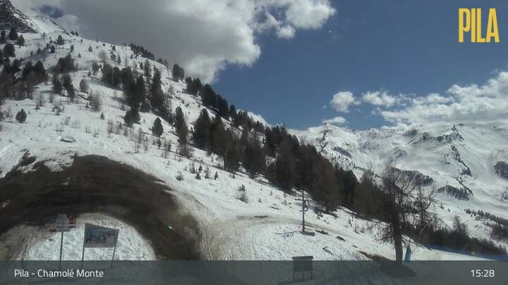 Die Webcam befindet sich an der Bergstation des Chamolé Sessellifts und blickt über die Berge des Aostatals.