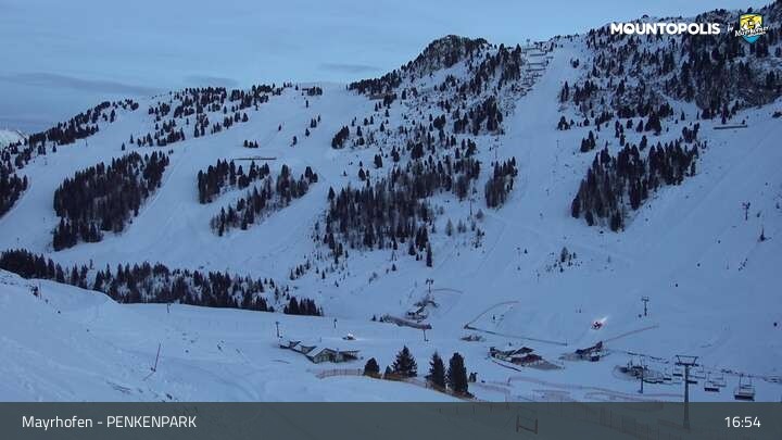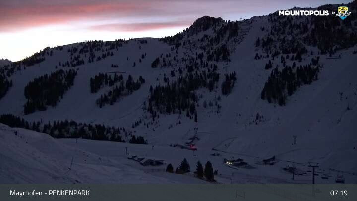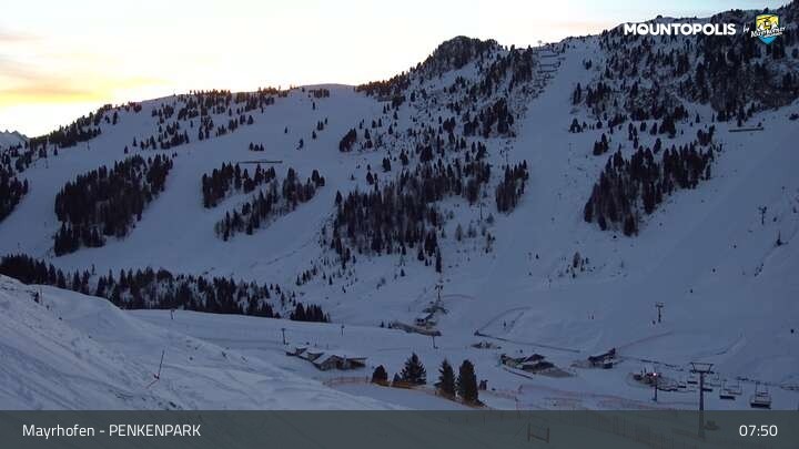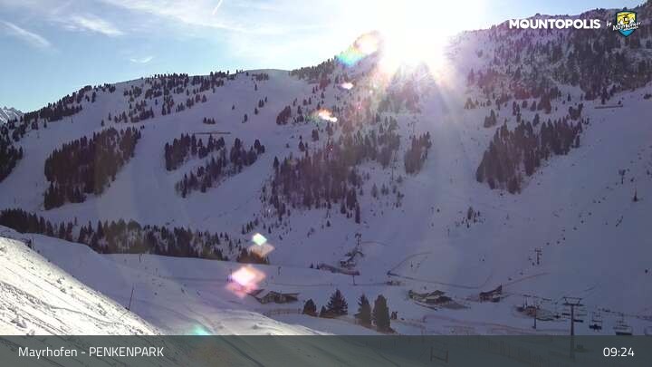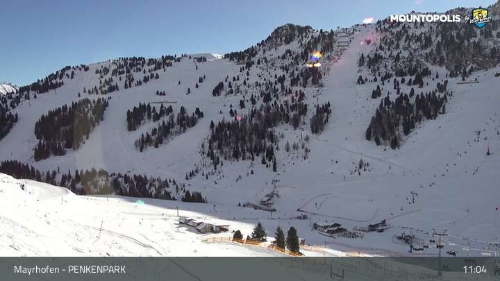 Hier blickst du auf den Vans Penken Park sowie den Sun-Jet Lift im Skigebiet Mayrhofen.