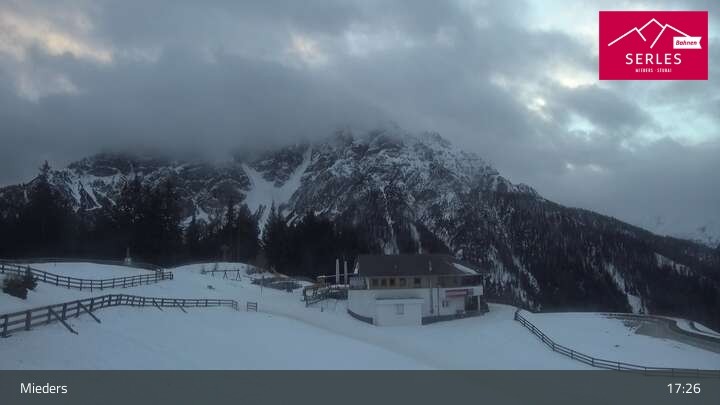 Die Webcam eröffnet den Blick von der Bergstation Koppeneck auf den Hausberg von Mieders, die Serles. Zu sehen sind außerdem das Bergrestaurant Koppeneck mit Kinderspielplatz und der Speichersee.