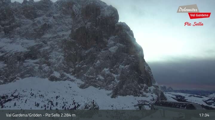 Ausblick von der Bergstation am Piz Sella in Val Gardena in Südirol. Zu sehen sind u.a. der Langkofel und die Sellagrupee.
