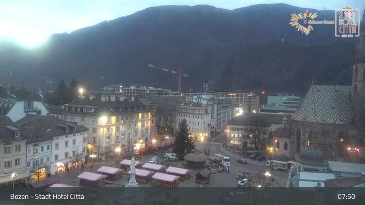 Ausblick vom Stadt Hotel Città auf den Waltherplatz in Bozen. Zu sehen ist auch der Dom Maria Himmelfahrt.
