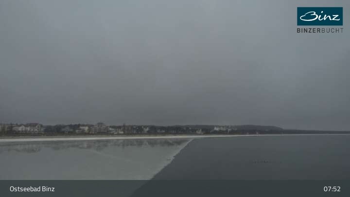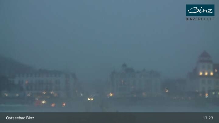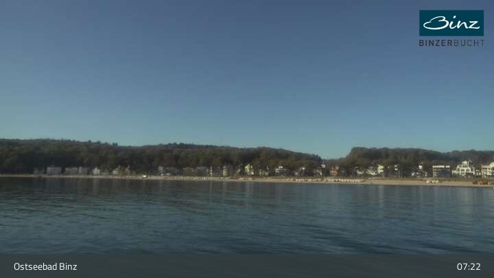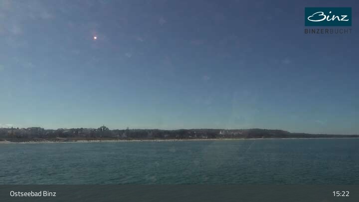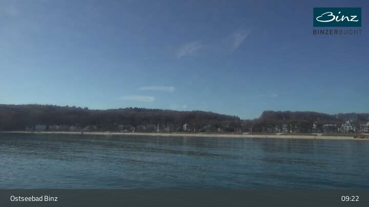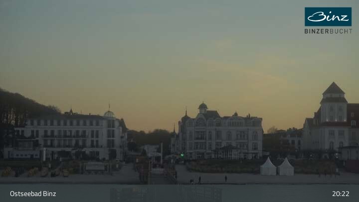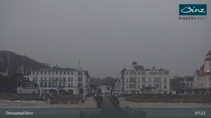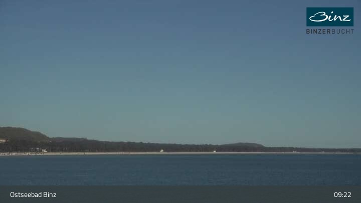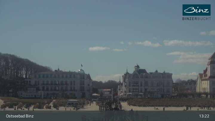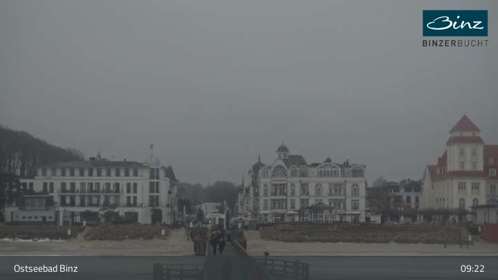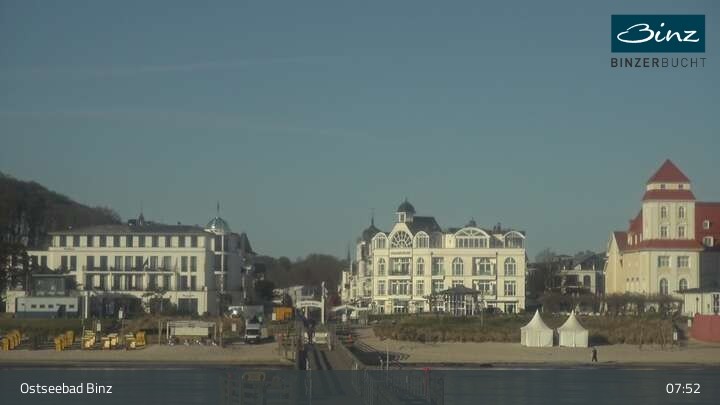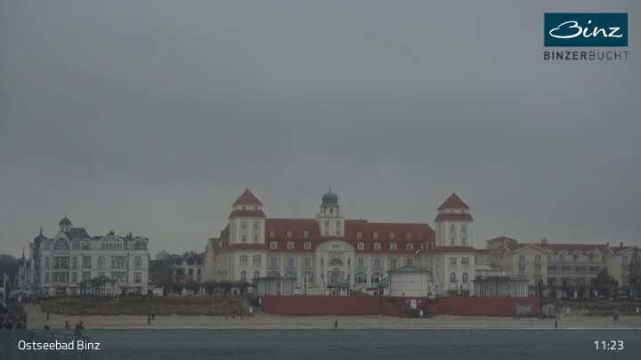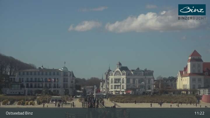 Zu sehen ist die Strandpromenade des Ostseebades Binz. Die Webcam ist auf der Seebrücke Binz positioniert und zeigt unter anderem Kurhaus, Strandpromenade und den Fischerstrand.