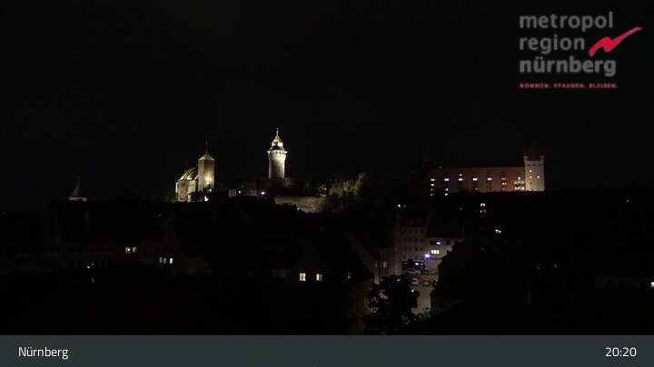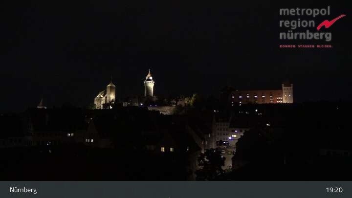 Blick über die Dächer Nürnbergs, die zweitgrößte Stadt Bayerns. Die Kamera ist in der Theresienstraße in der Altstadt positioniert und zeigt unter anderem die Kaiserburg, das Rathaus und das Staatstheater.