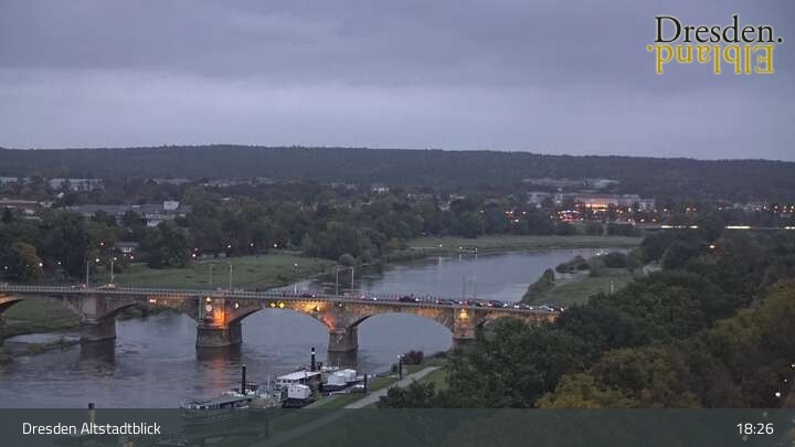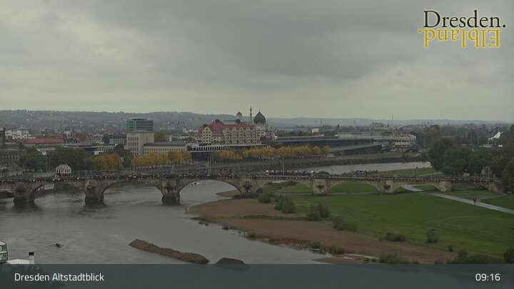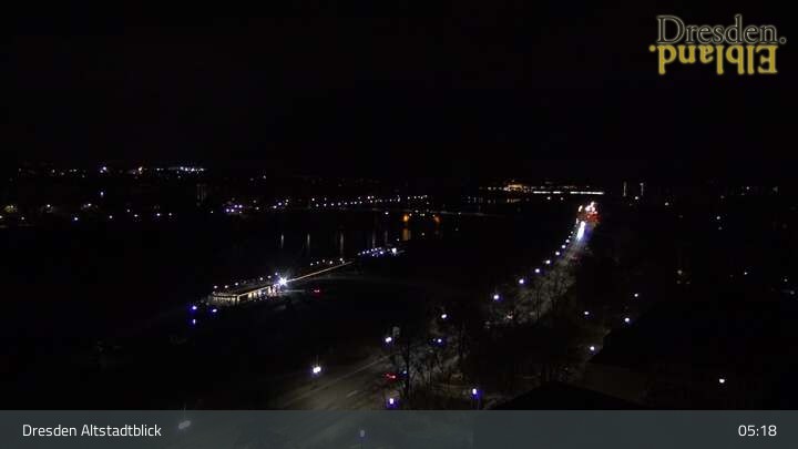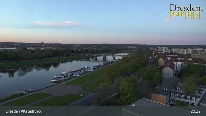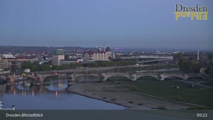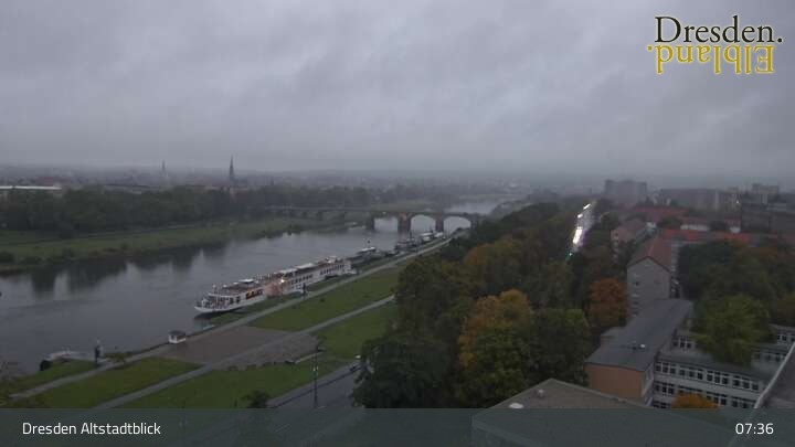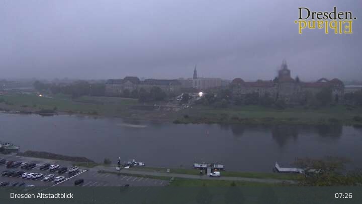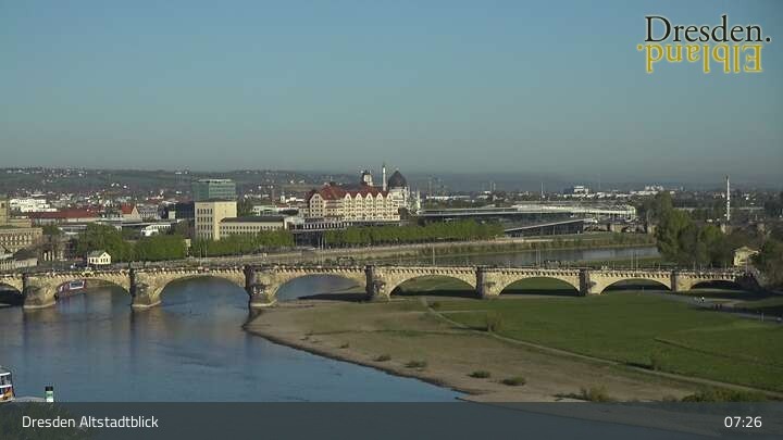 Die Kamera befindet sich am Hotel am Terrassenufer in Dresden und blickt auf die Altstadt und die Elbe.