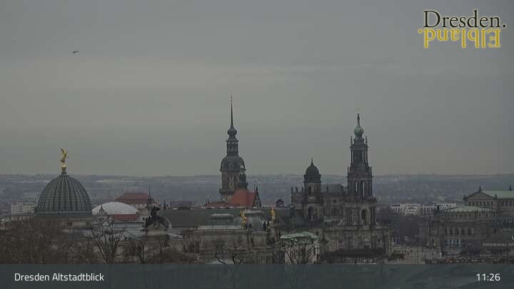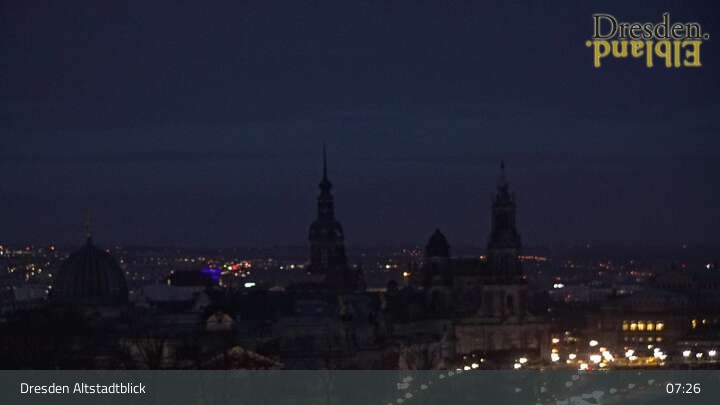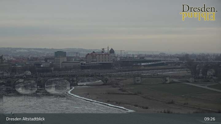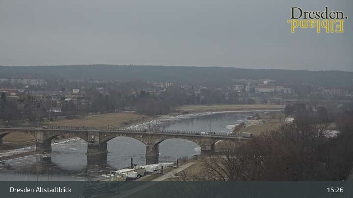 Die Kamera befindet sich am Hotel am Terrassenufer in Dresden und blickt auf die Altstadt und die Elbe.