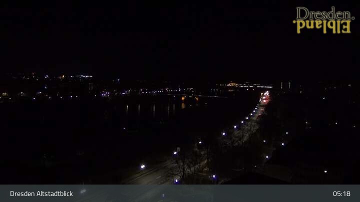 Die Kamera befindet sich am Hotel am Terrassenufer in Dresden und blickt auf die Altstadt und die Elbe.