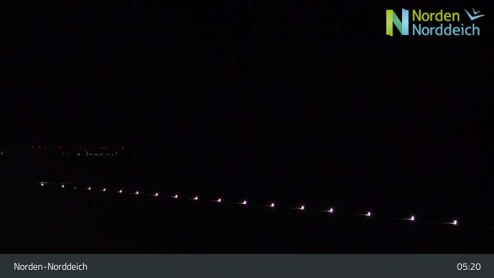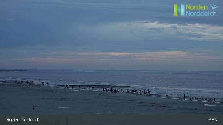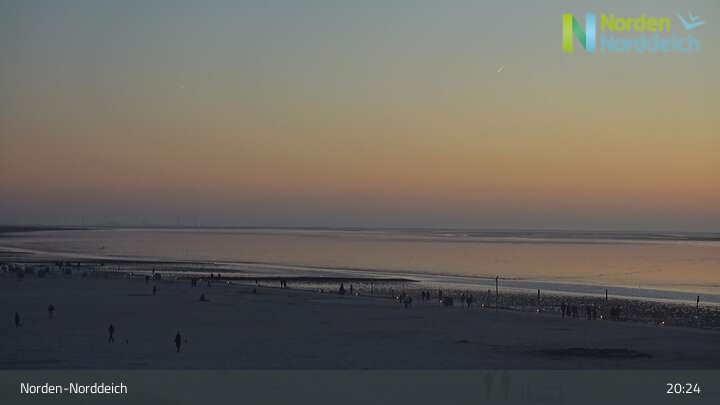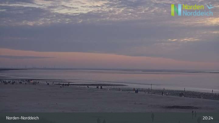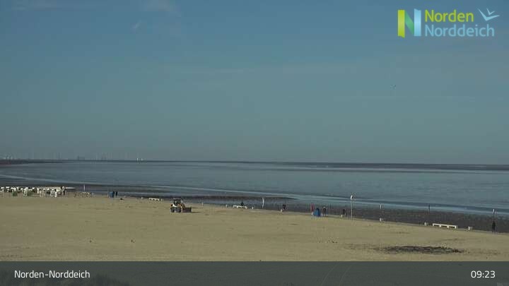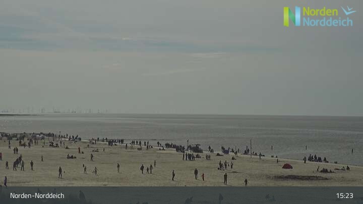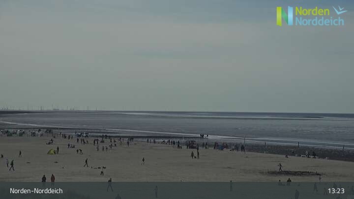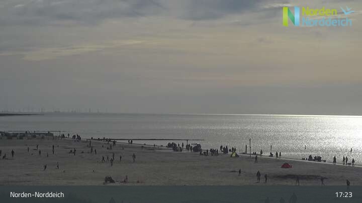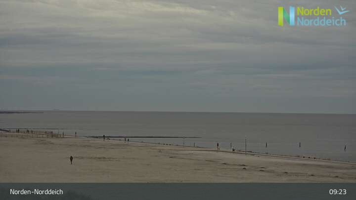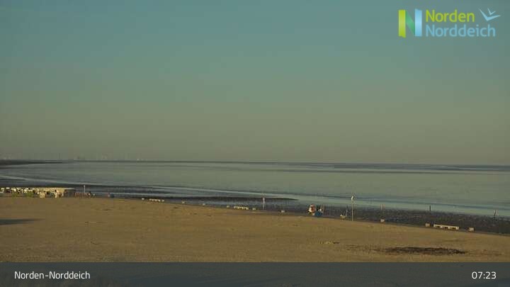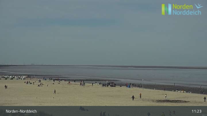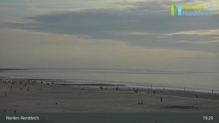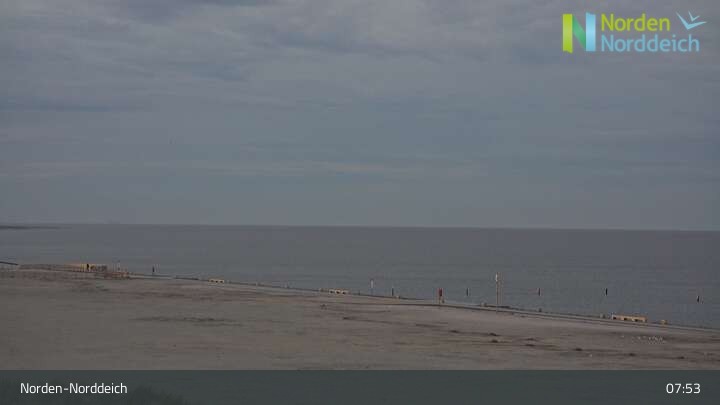 Blick auf den Strand von Norden-Norddeich an der Nordsee. Auf dem Webcambild kannst du im Sommer gut die vielen Strandkörbe erkennen. Die DLRG hat auch eine Station am Strand.
