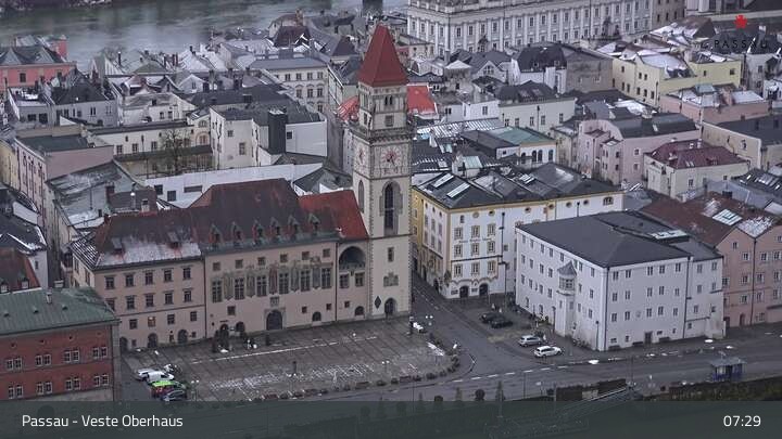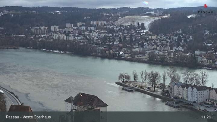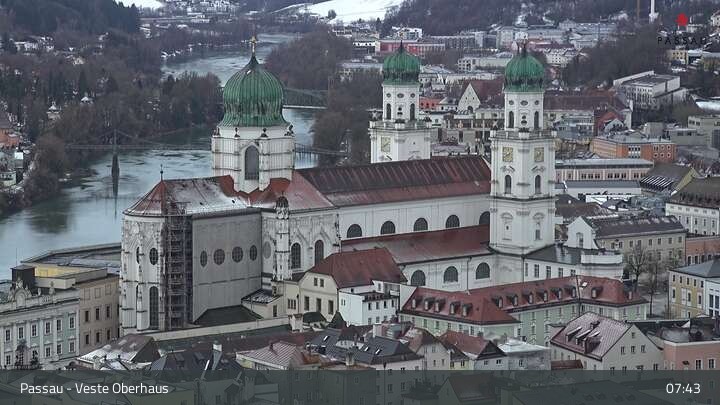 Die Webcam zeigt einen tollen Panoramablick von der Veste Oberhaus auf die Donau und die Altstadt von Passau. Neber der herrschaftlichen Burgfassade sieht man sehr gut die Landzunge zwischen Donau und Inn, auf der die Altstadt mit ihren denkmalgeschützten Häusern liegt. Gut zu erkennen sind unter anderem die Ortspitze am Zusammenfluss der drei Flüsse, das an der Donau liegende Rathaus, der weiße Dom St. Stephan und das erhöhte Kloster Mariahilf in der Innstadt.