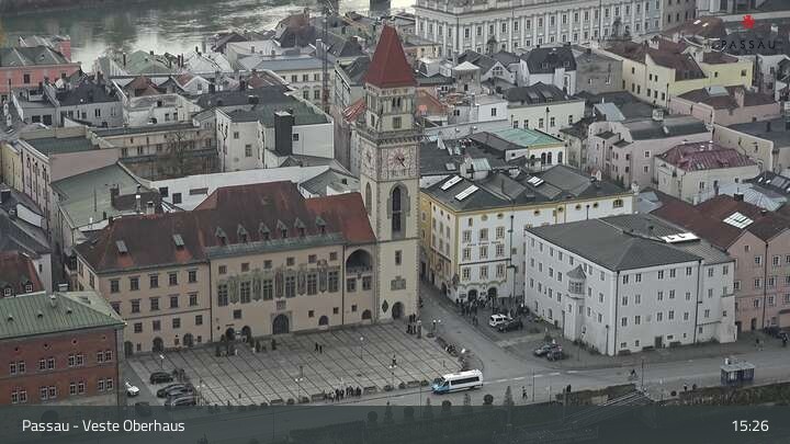 Die Webcam zeigt dir den Blick von der Veste Oberhaus über die Donau zur Altstadt der niederbayerischen Stadt Passau. Sehr gut zu erkennen sind links Teile der Burgveste, die Ortspitze wo die drei Flüsse Donau, Inn und Ilz zusammenfließen, die Hängebrücke über die Donau und rechts der weiße Stephansdom.