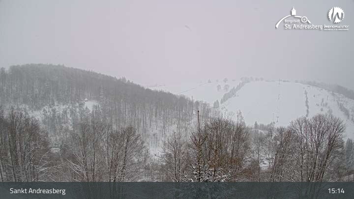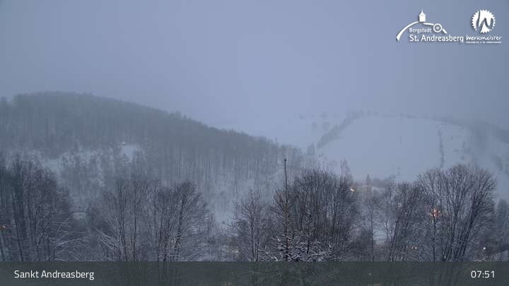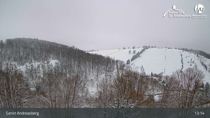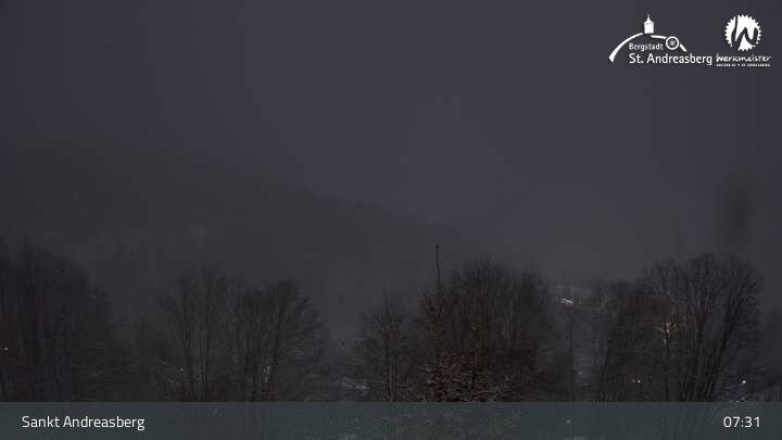 Die Kamera blickt vom Harz-BnB Werkmeister in Sankt Andreasberg nach Süden auf die Alberti-Lifte am Matthias-Schmidt-Berg. Im Winter sind die Lifte für Skifahrer in Betrieb, im Sommer wartet hier eine Sommerrodelbahn sowie ein Mountainbike- und Downhill-Erlebnispark.