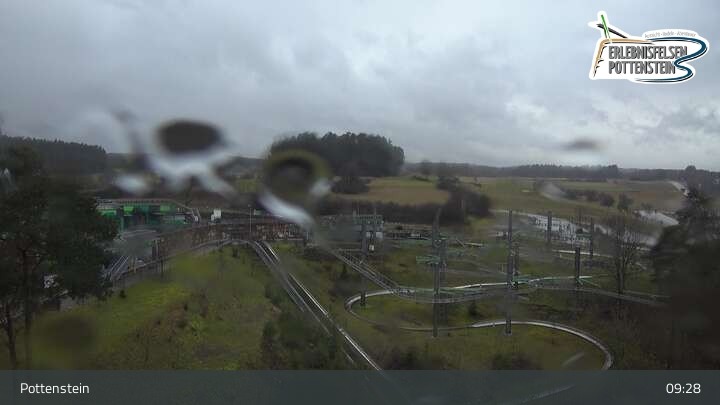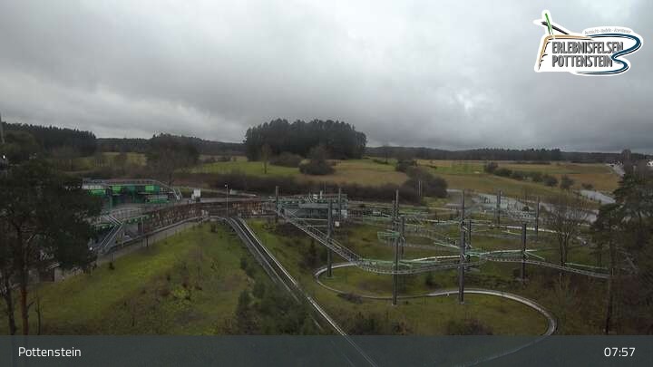 Toller Panoramablick auf den Erlebnisfelsen Pottenstein und seine Attraktionen. Es gibt dort zwei Rodelbahnen, den Hexenbesen als eine Art Achterbahn, einen Skywalk und eine Trampolinanlage.