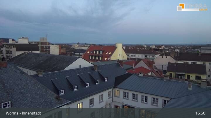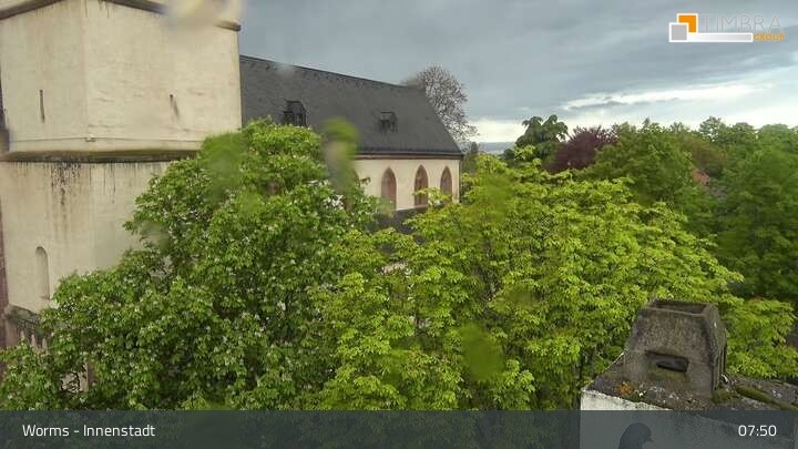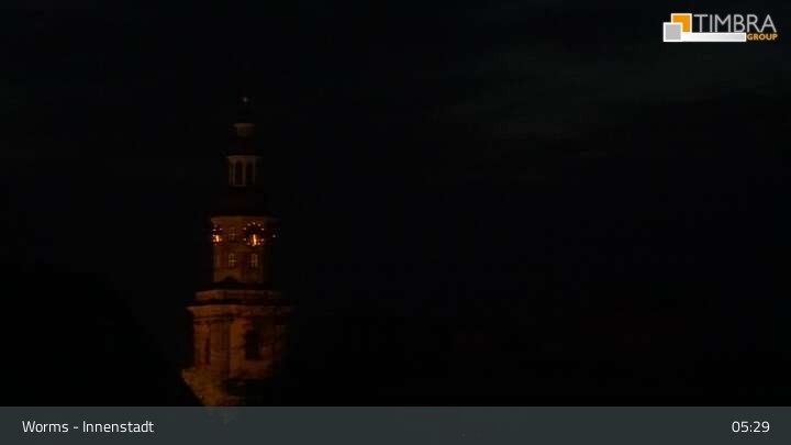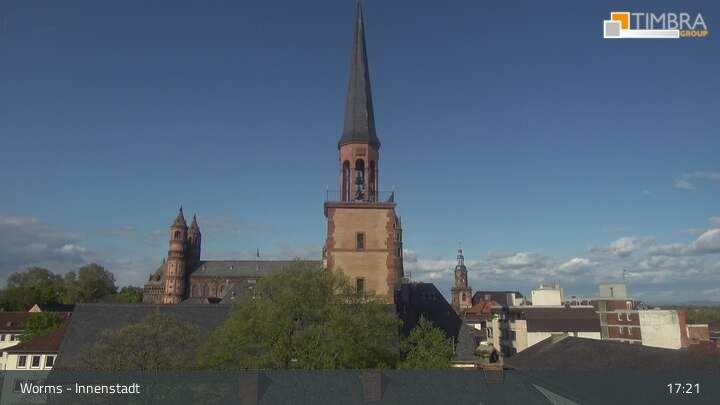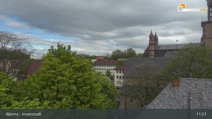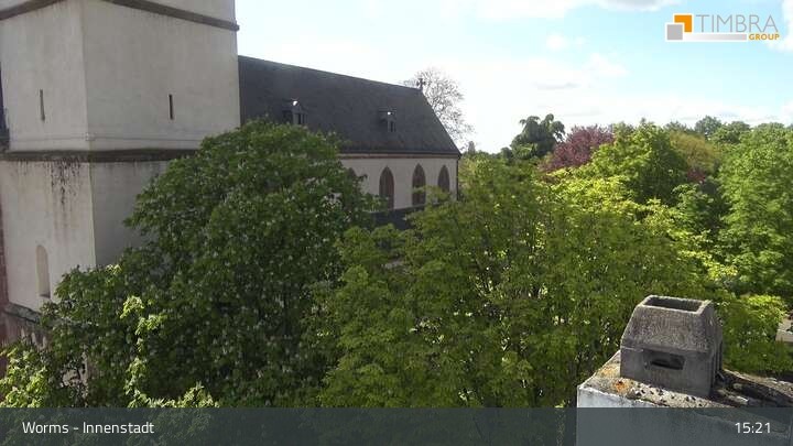 Die Webcam befindet sich in der Wormser Innenstadt. Der Blick wandert von der Magnuskirche, hinter welcher die Türme des Wormser Doms St. Peter zu sehen ist über die Dächer der Stadt bis zum Andreasstift und der Stadtmauer.