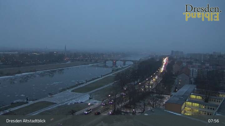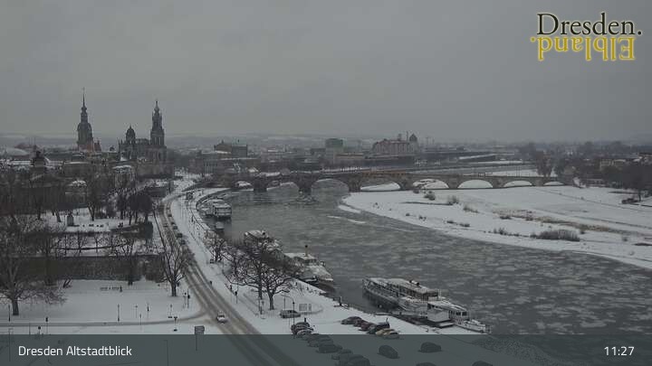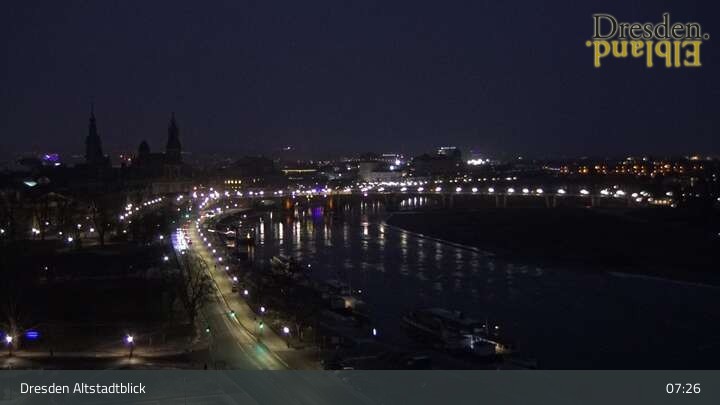 Die Kamera befindet sich am Hotel am Terrassenufer in Dresden und blickt auf die Altstadt und die Elbe.