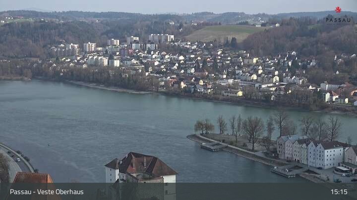 Die Webcam zeigt dir den Blick von der Veste Oberhaus über die Donau zur Altstadt der niederbayerischen Stadt Passau. Sehr gut zu erkennen sind links Teile der Burgveste, die Ortspitze wo die drei Flüsse Donau, Inn und Ilz zusammenfließen, die Hängebrücke über die Donau und rechts der weiße Stephansdom.