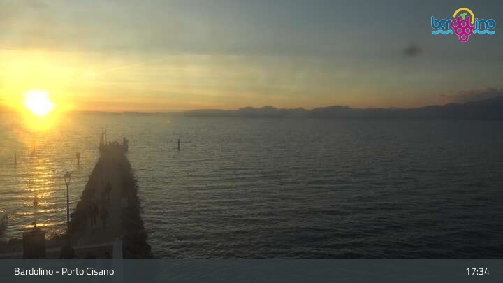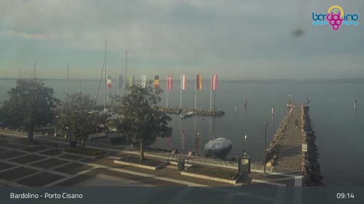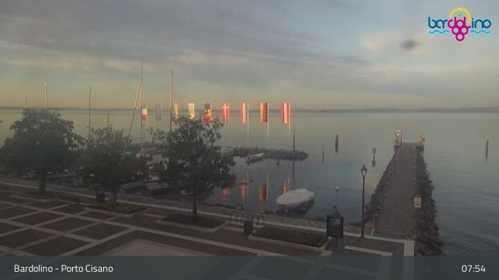 Die Kamera befindet sich am Strand Lido Mirabello und blickt nach Norden auf den Hafen von Bardolino am Gardasee.