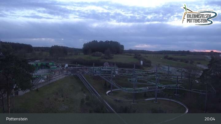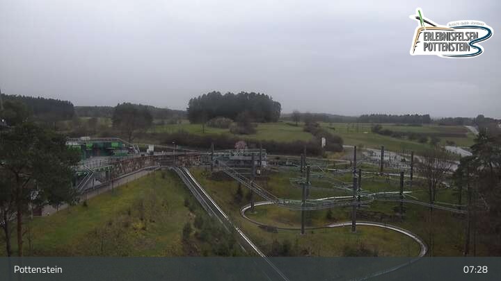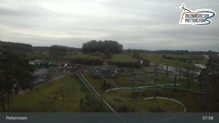 Toller Panoramablick auf den Erlebnisfelsen Pottenstein und seine Attraktionen. Es gibt dort zwei Rodelbahnen, den Hexenbesen als eine Art Achterbahn, einen Skywalk und eine Trampolinanlage.