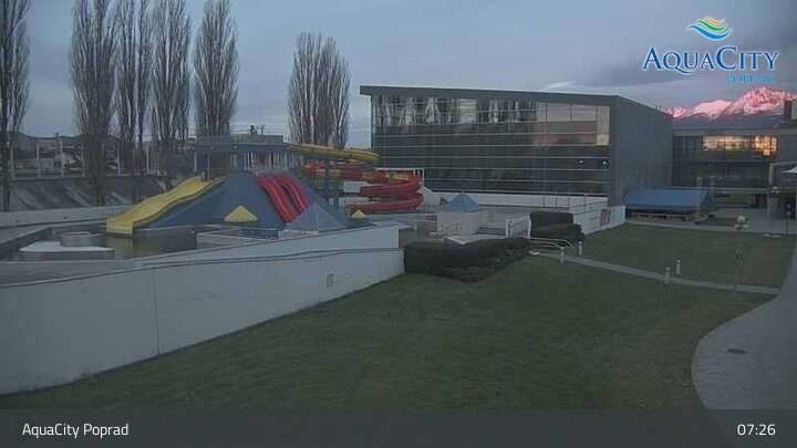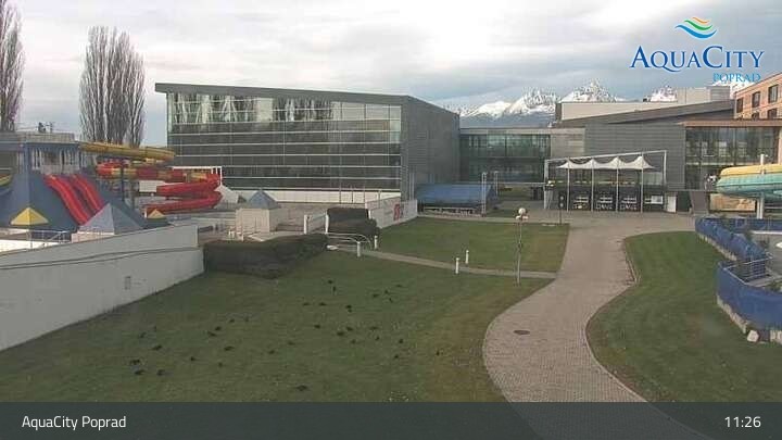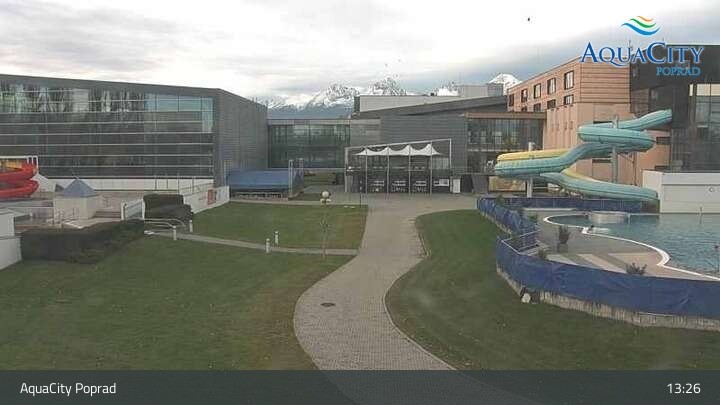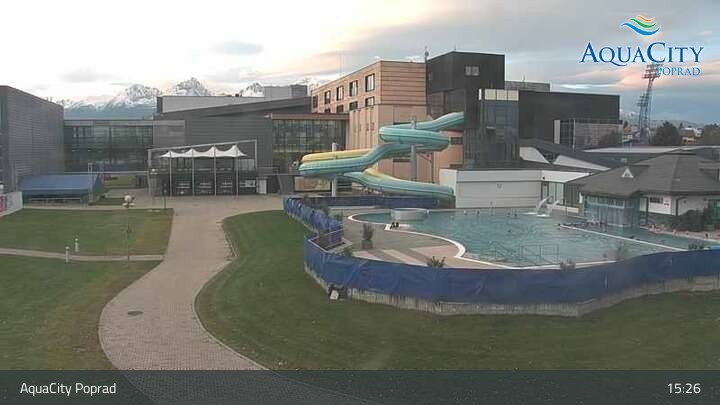 Sicht auf den Außenbereich der AquaCity in der slowakischen Stadt Poprad am Fuße der Tatra.