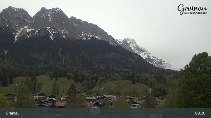 Die Live-Webcam zeigt vom Freibad aus einen Rundumblick auf das Bergdorf Grainau und seine Umgebung. Zu sehen sind unter anderem die Zugspitze, der große und kleine Waxenstein sowie der Hohe Ziegspitz.