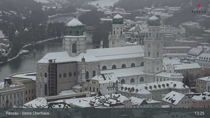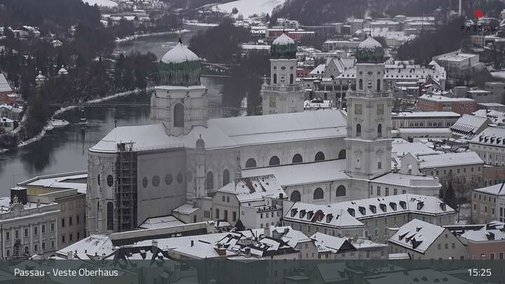 Die Webcam zeigt einen tollen Panoramablick von der Veste Oberhaus auf die Donau und die Altstadt von Passau. Neber der herrschaftlichen Burgfassade sieht man sehr gut die Landzunge zwischen Donau und Inn, auf der die Altstadt mit ihren denkmalgeschützten Häusern liegt. Gut zu erkennen sind unter anderem die Ortspitze am Zusammenfluss der drei Flüsse, das an der Donau liegende Rathaus, der weiße Dom St. Stephan und das erhöhte Kloster Mariahilf in der Innstadt.