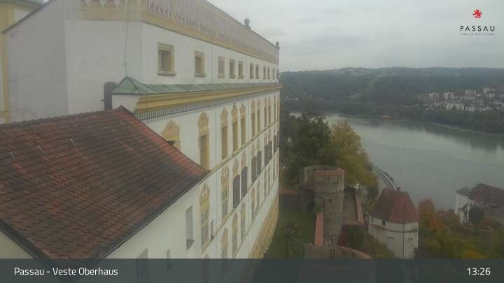 Die Webcam zeigt dir den Blick von der Veste Oberhaus über die Donau zur Altstadt der niederbayerischen Stadt Passau. Sehr gut zu erkennen sind links Teile der Burgveste, die Ortspitze wo die drei Flüsse Donau, Inn und Ilz zusammenfließen, die Hängebrücke über die Donau und rechts der weiße Stephansdom.