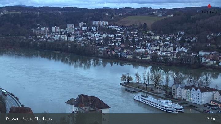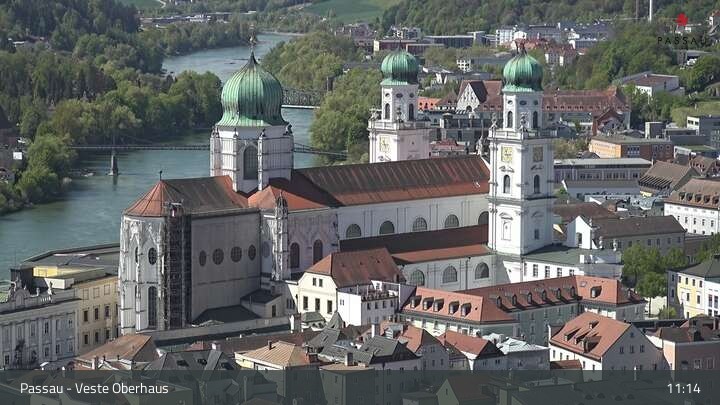 Die Webcam zeigt dir den Blick von der Veste Oberhaus über die Donau zur Altstadt der niederbayerischen Stadt Passau. Sehr gut zu erkennen sind links Teile der Burgveste, die Ortspitze wo die drei Flüsse Donau, Inn und Ilz zusammenfließen, die Hängebrücke über die Donau und rechts der weiße Stephansdom.