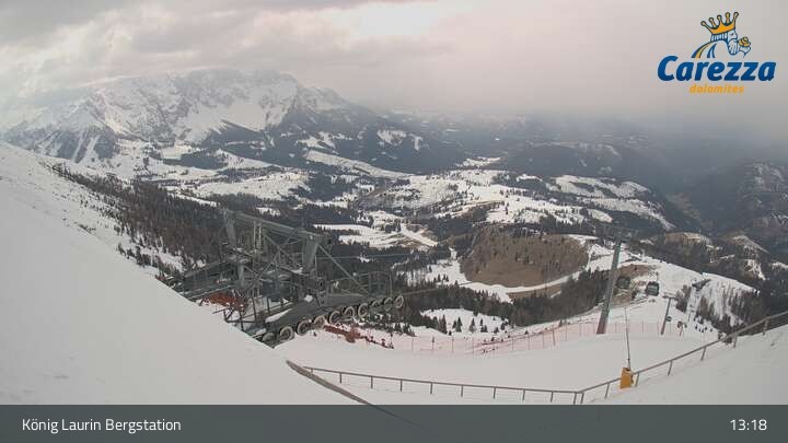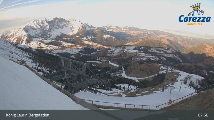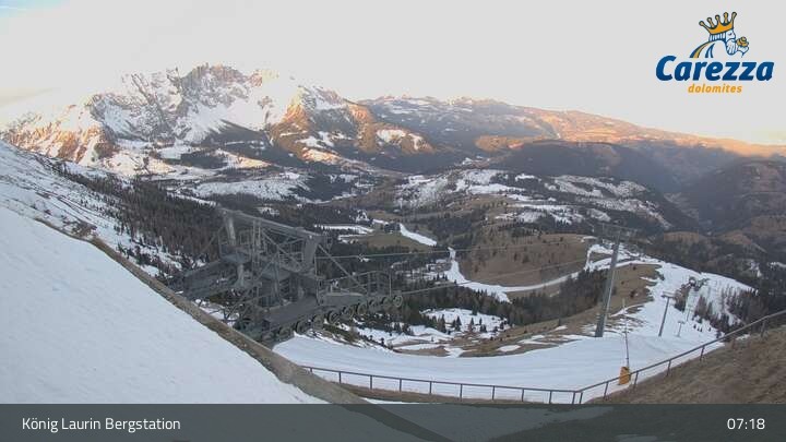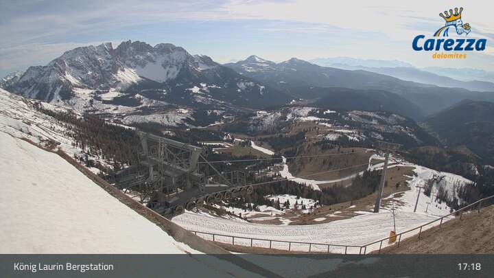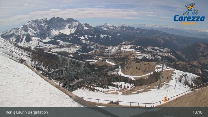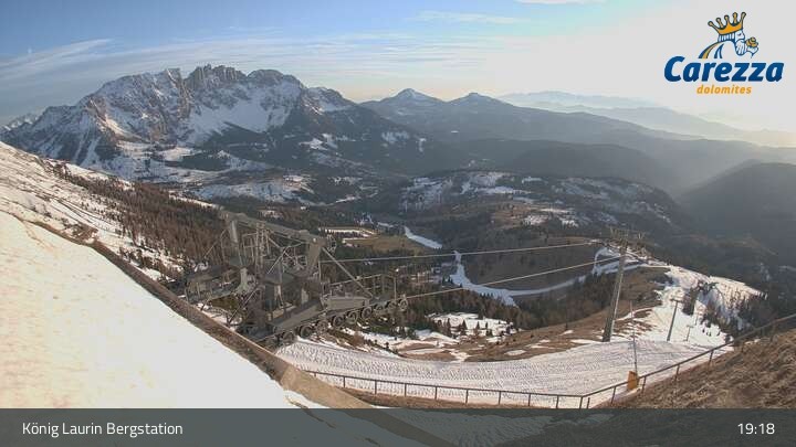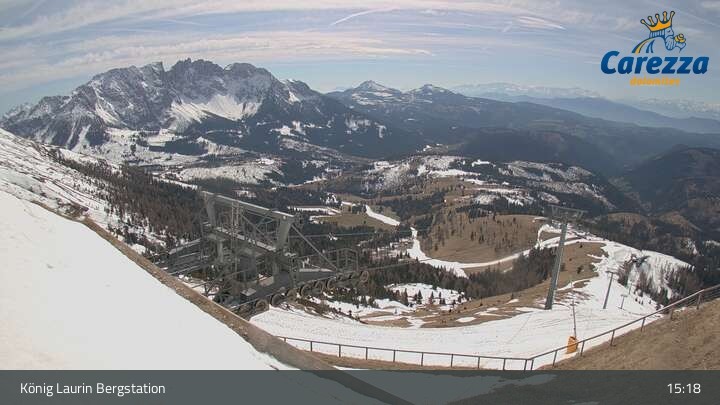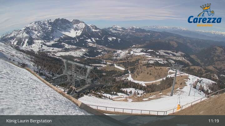Die Webcam eröffnet von der Kölner Hütte das Panorama zum Latemar. Du siehst hier auch gut die neue König Laurin Gondelbahn mit unterirdischer Bergstation.
