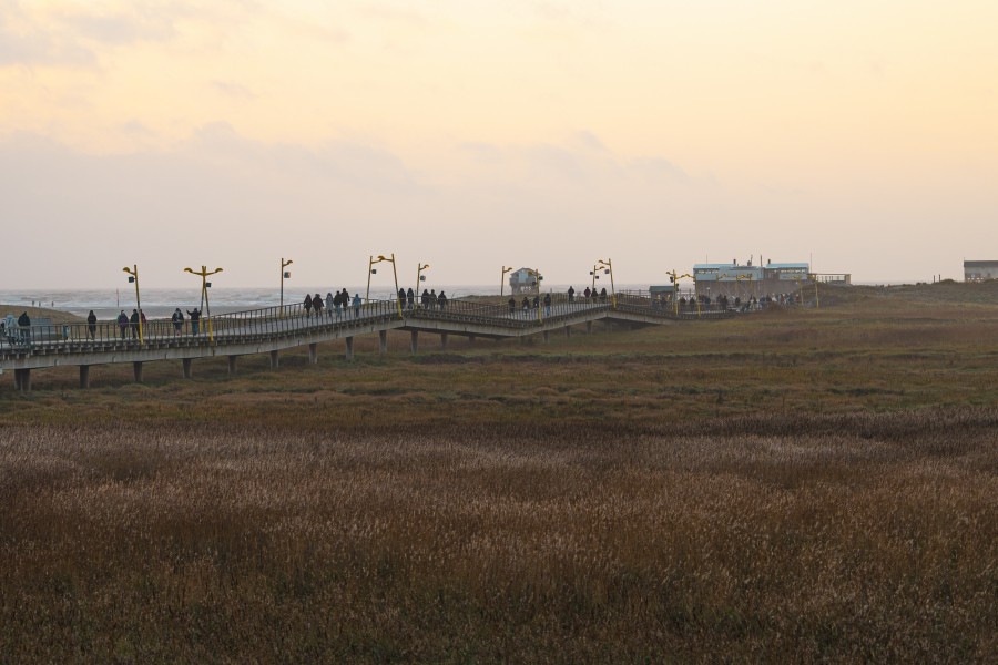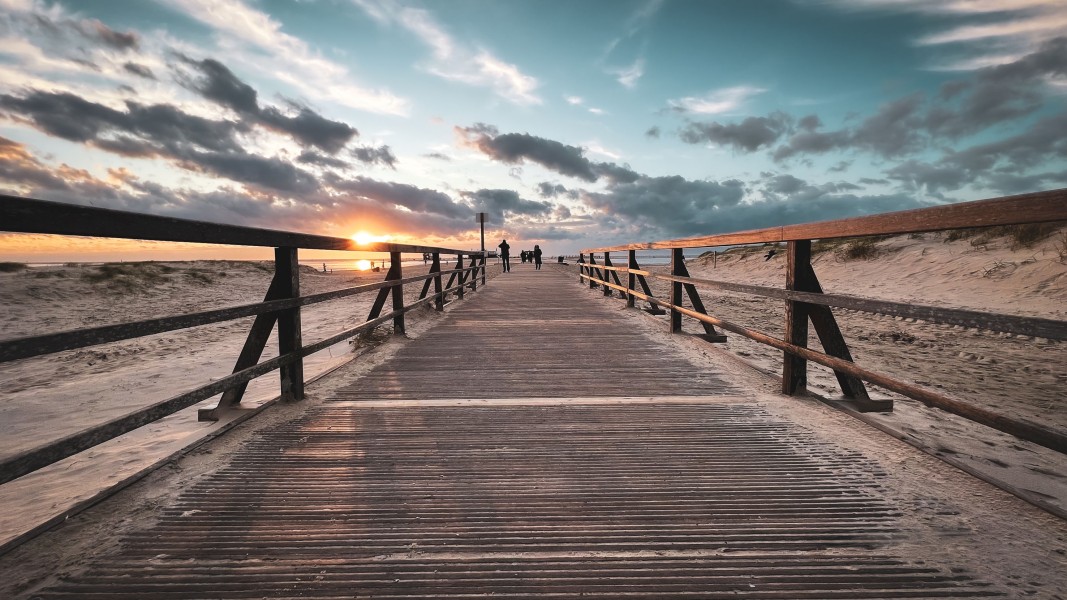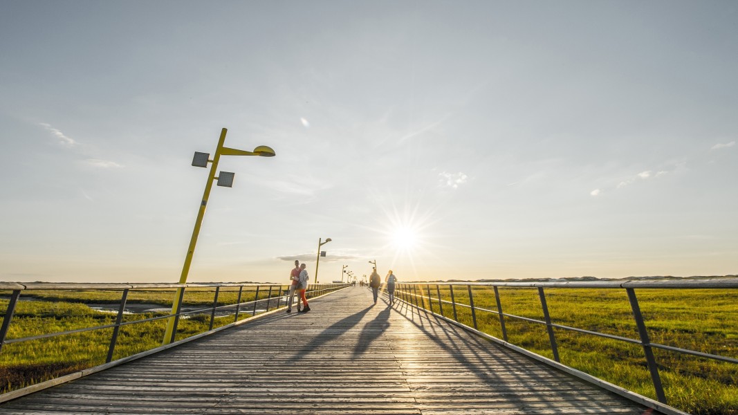 Die Seebrücke in St. Peter-Ording auf der Halbinsel Eiderstedt gehört mit einer Länge von 1.095 Metern zu den längsten Seebrücken Deutschlands und ist eines der bekanntesten Wahrzeichen der schleswig-holsteinischen Nordseeküste. Vom Ortsteil Bad führt die barrierefreie Holzkonstruktion über Salzwiesen, Dünen und Priele direkt an den Strand und die Nordsee.