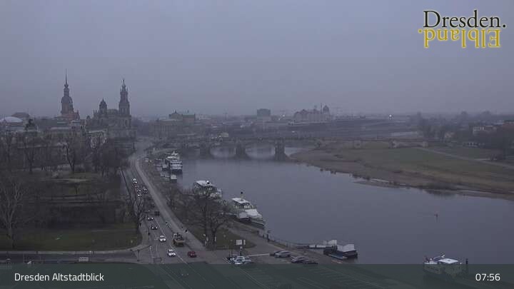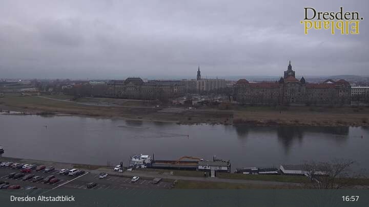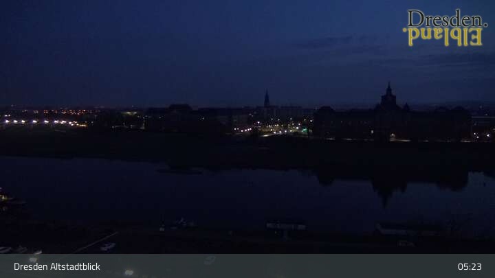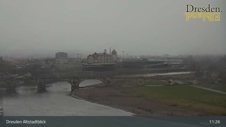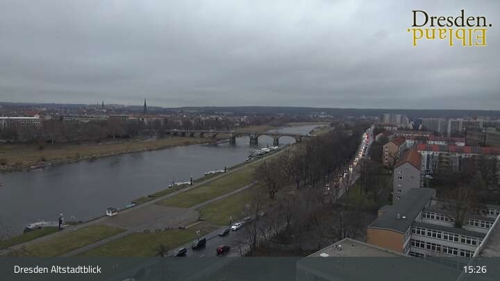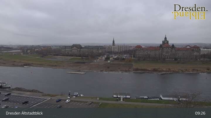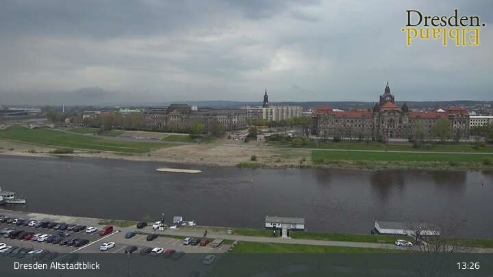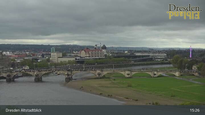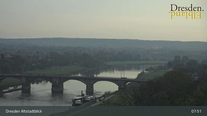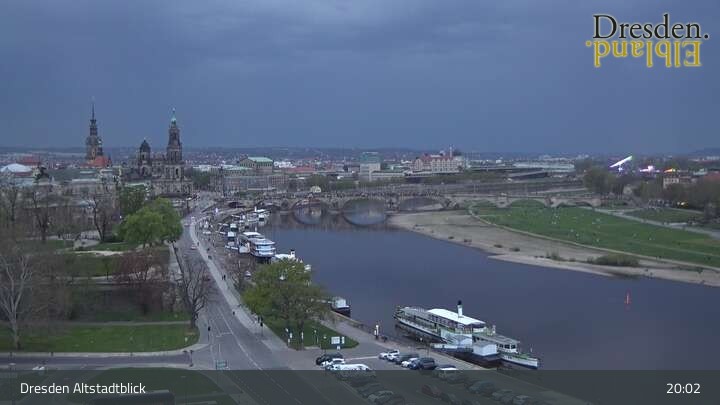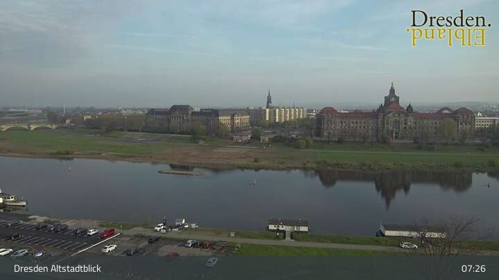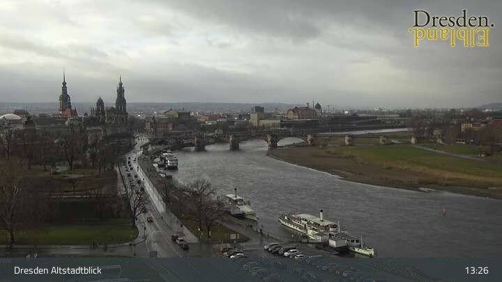 Die Kamera befindet sich am Hotel am Terrassenufer in Dresden und blickt auf die Altstadt und die Elbe.