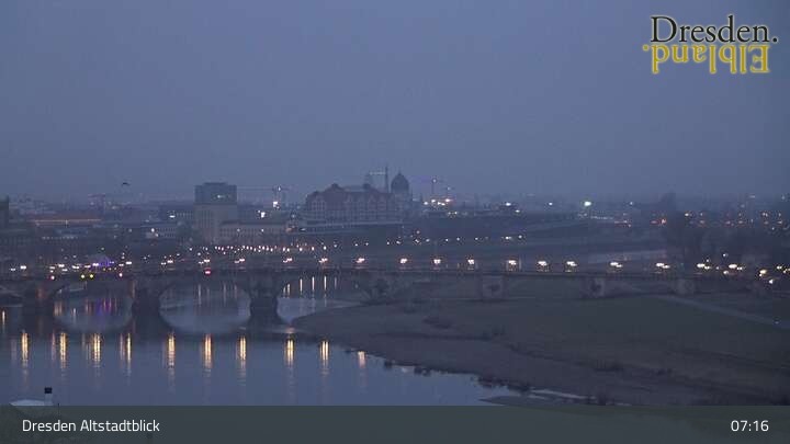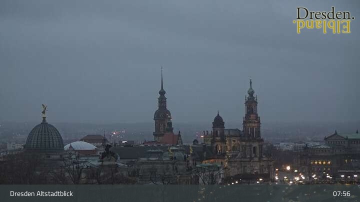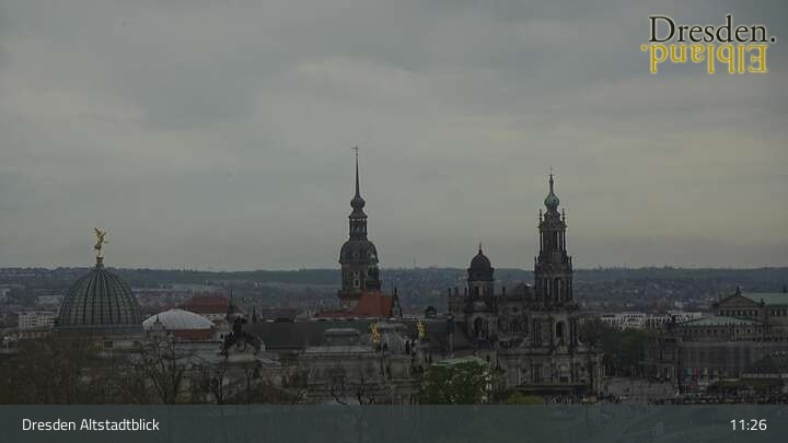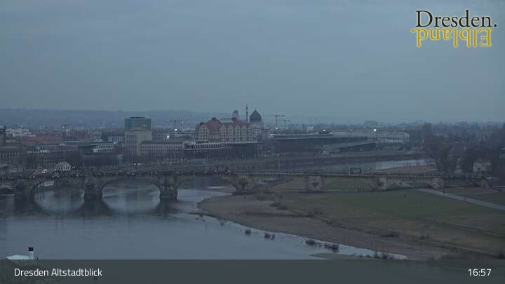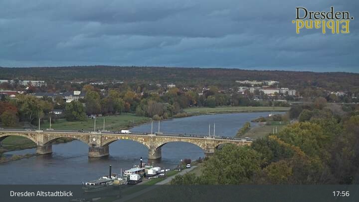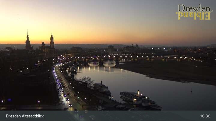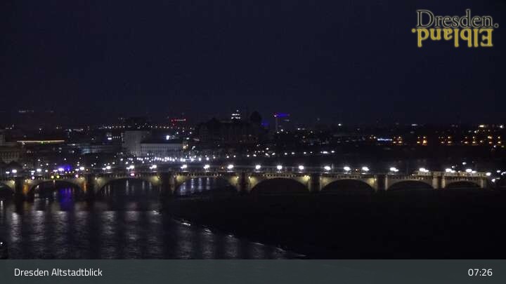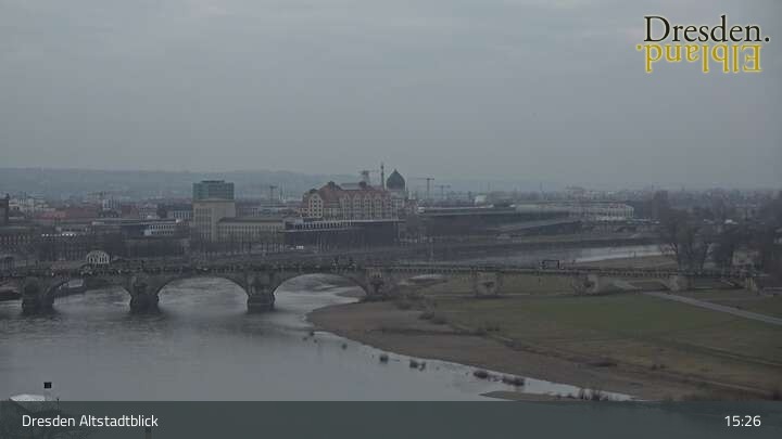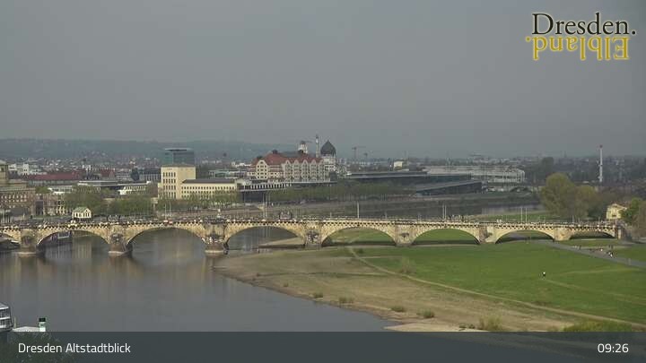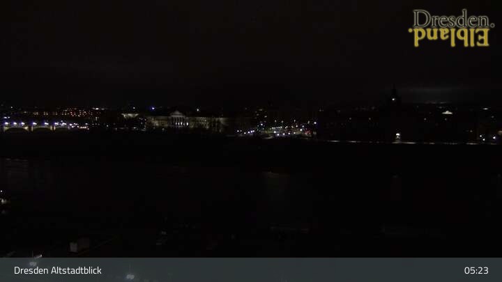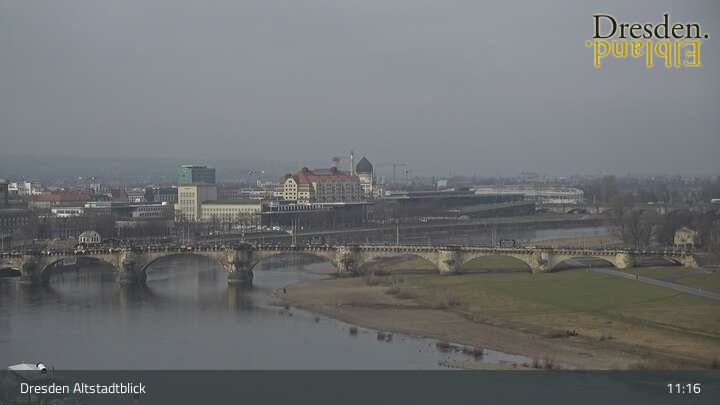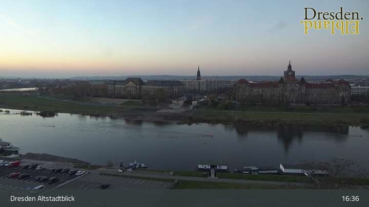 Die Kamera befindet sich am Hotel am Terrassenufer in Dresden und blickt auf die Altstadt und die Elbe.