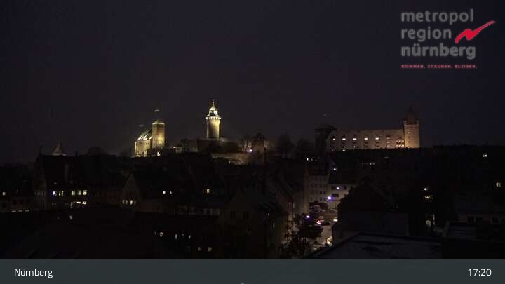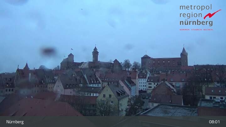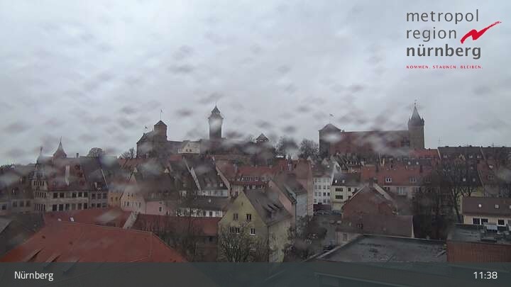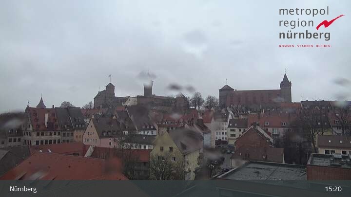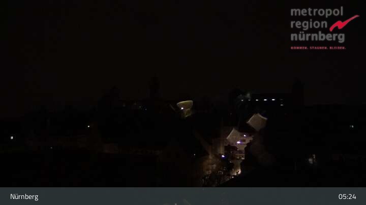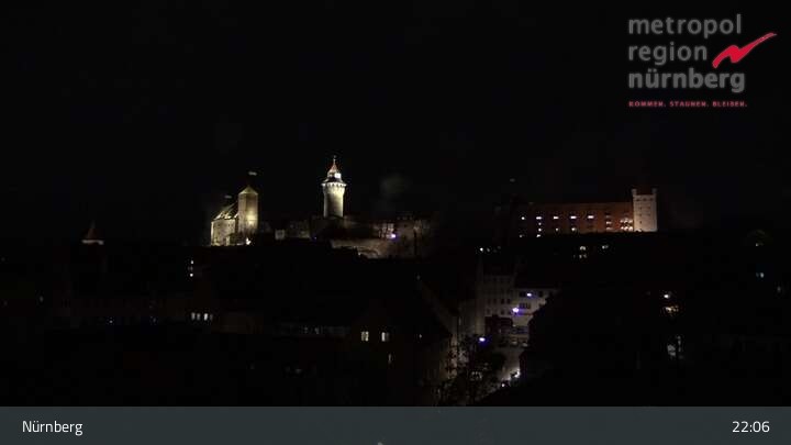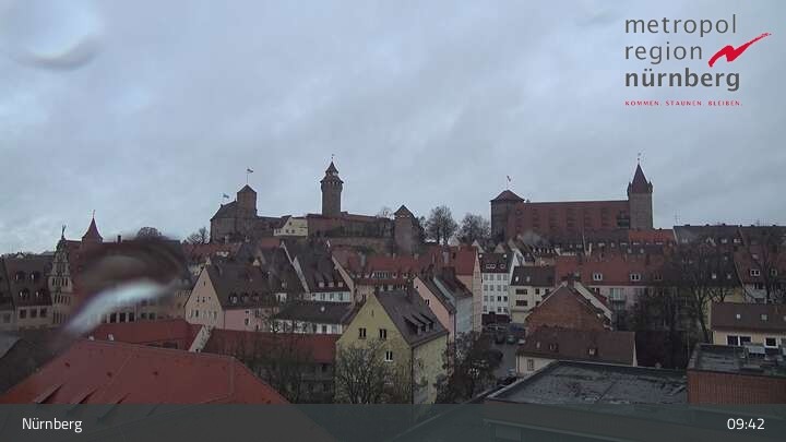 Blick über die Dächer Nürnbergs, die zweitgrößte Stadt Bayerns. Die Kamera ist in der Theresienstraße in der Altstadt positioniert und zeigt unter anderem die Kaiserburg, das Rathaus und das Staatstheater.