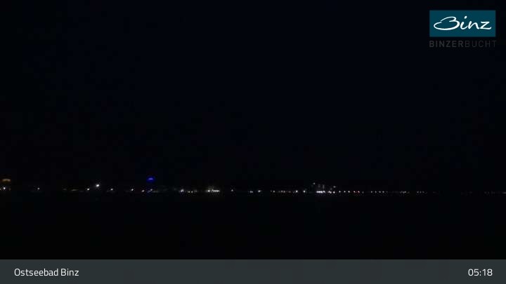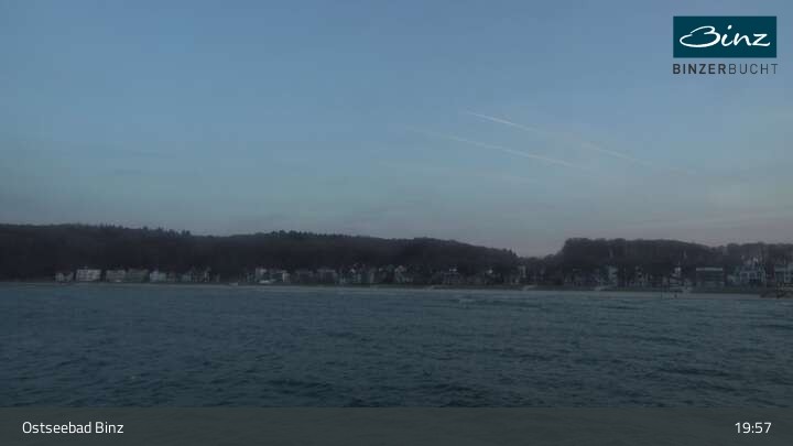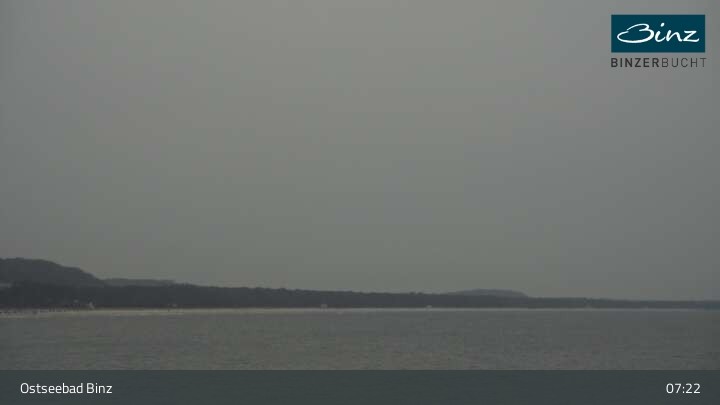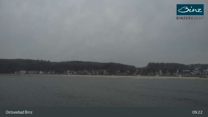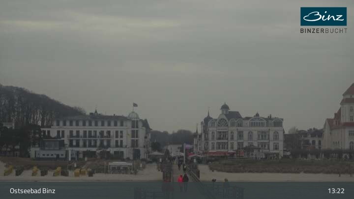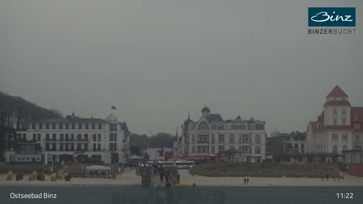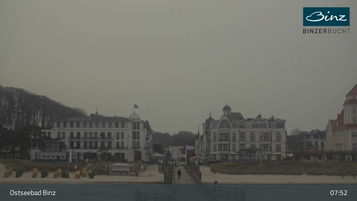 Zu sehen ist die Strandpromenade des Ostseebades Binz. Die Webcam ist auf der Seebrücke Binz positioniert und zeigt unter anderem Kurhaus, Strandpromenade und den Fischerstrand.