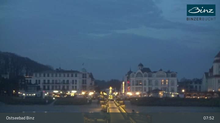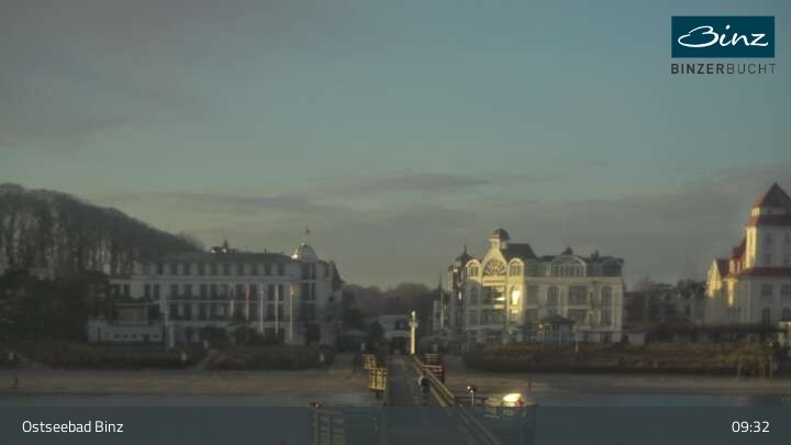 Zu sehen ist die Strandpromenade des Ostseebades Binz. Die Webcam ist auf der Seebrücke Binz positioniert und zeigt unter anderem Kurhaus, Strandpromenade und den Fischerstrand.