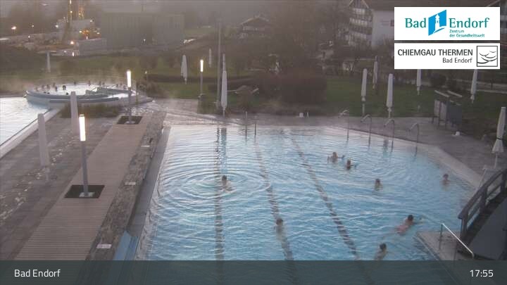 Hier sieht man einen Teil der Außenbecken der beliebten Chiemgau Therme in Bad Endorf im Landkreis Rosenheim.
