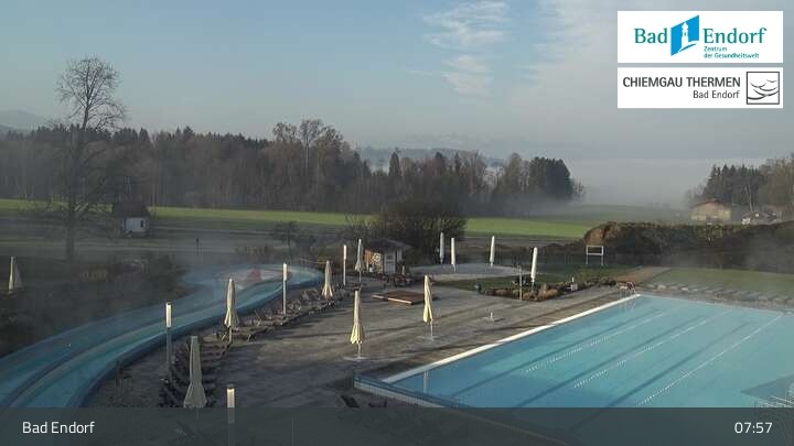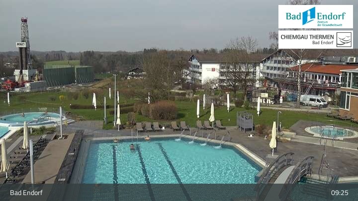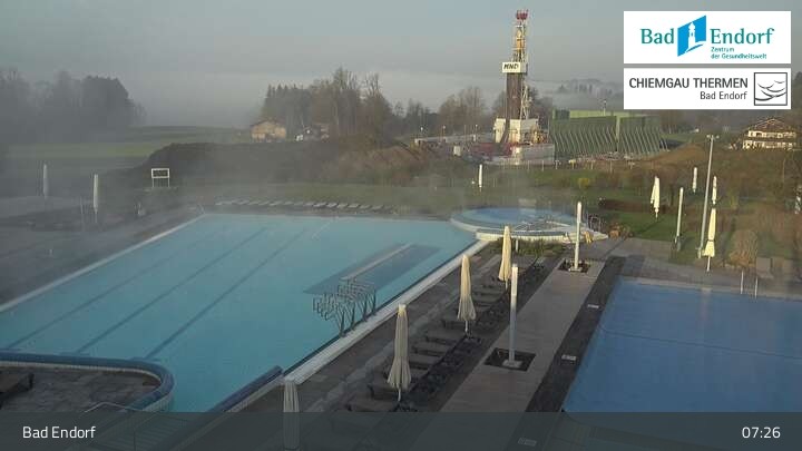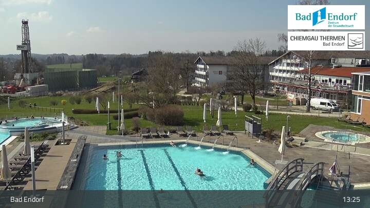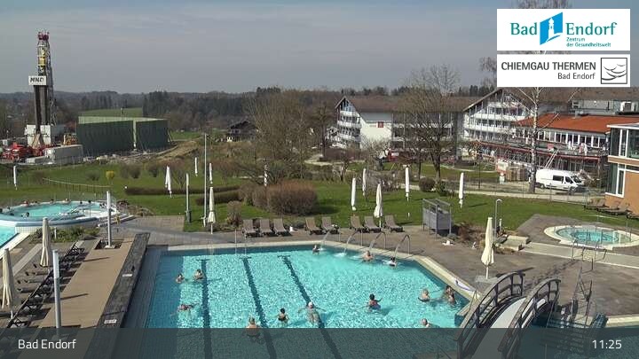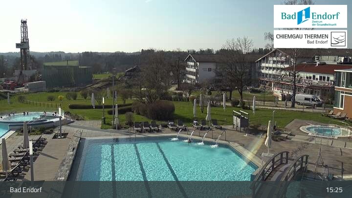 Die Webcam bietet einen Blick das Außengelände der Chiemgau Therme in Bad Endorf. Zu sehen ist unter anderem auch der 125 Meter lange Strömungskanal, ein Highlight der Therme im Landkreis Rosenheim.