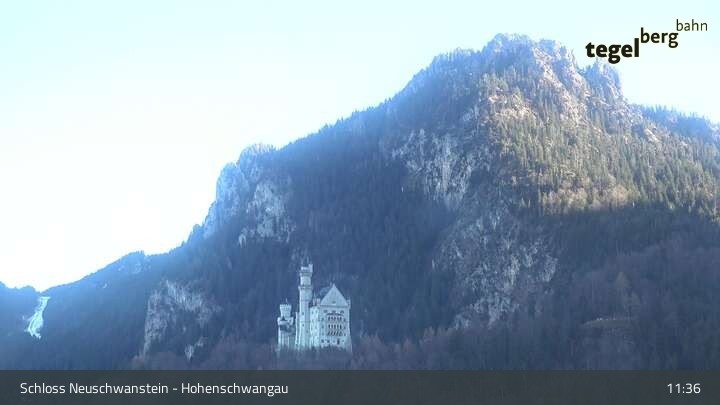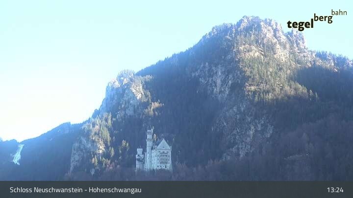 Die Kamera befindet sich am Schloss Hohenschwangau und schwenkt vom Schloss Neuschwanstein zum Museum der Bayerischen Könige.
