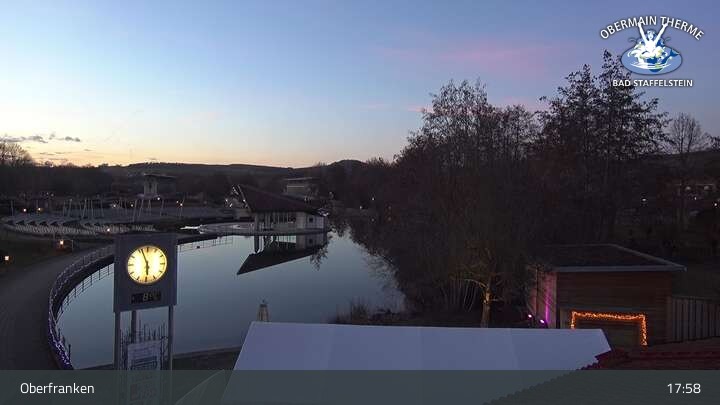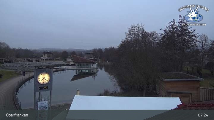 Blick auf die Seebühne im Bad Staffelsteiner Kurpark in Oberfranken. In den Sommermonaten wird hier ein Mix aus Konzerten und Veranstaltungen geboten.