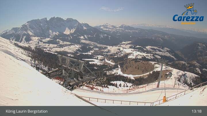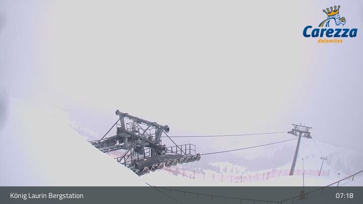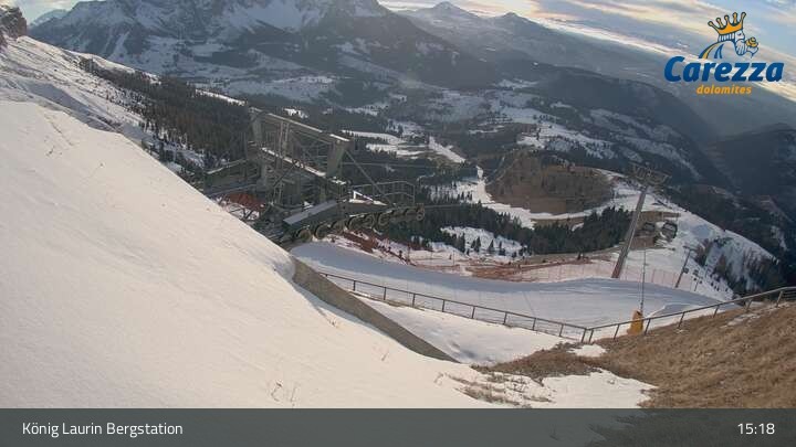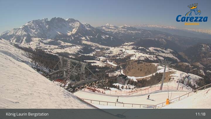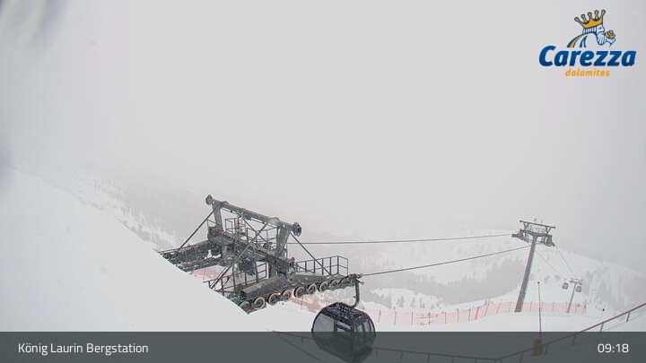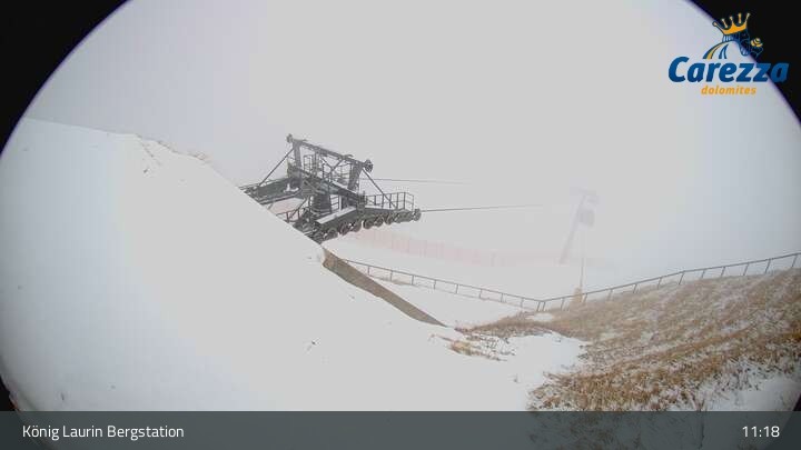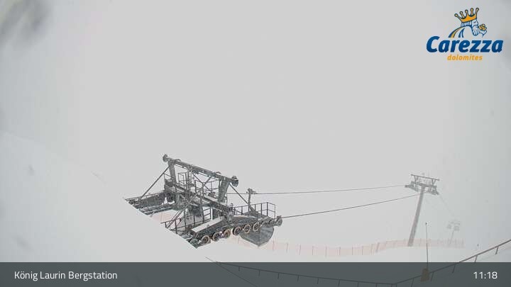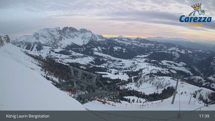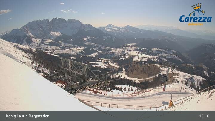Die Webcam eröffnet von der Kölner Hütte das Panorama zum Latemar. Du siehst hier auch gut die neue König Laurin Gondelbahn mit unterirdischer Bergstation.