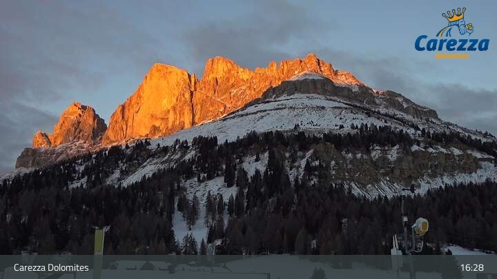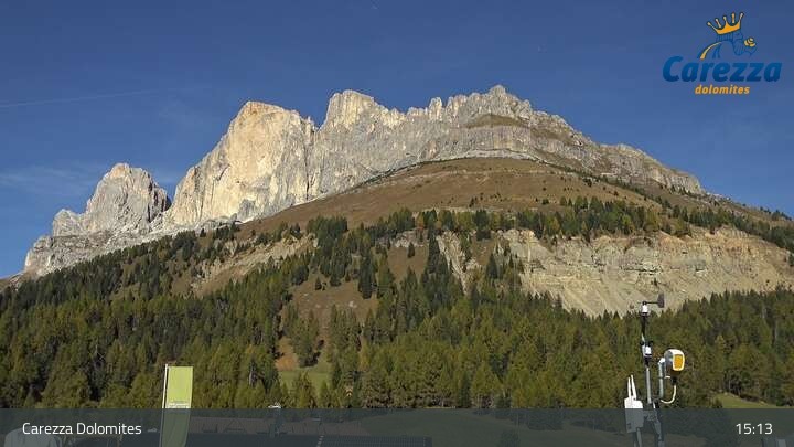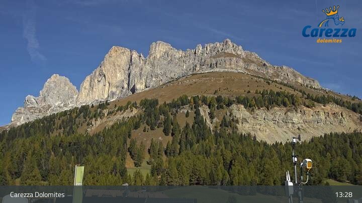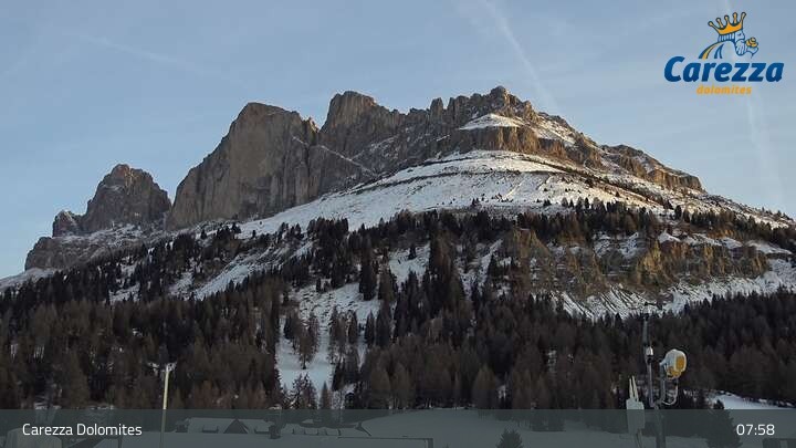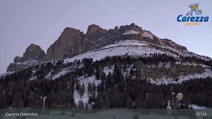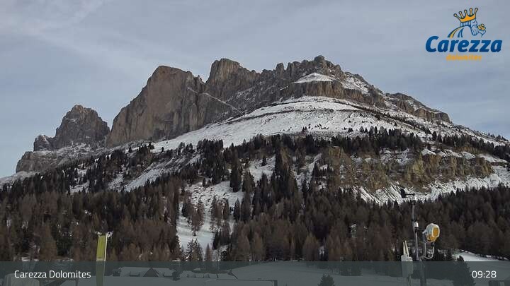 Hier siehst du die Talstation des Sessellifts Pra di Tori sowie die Berge von Carezza