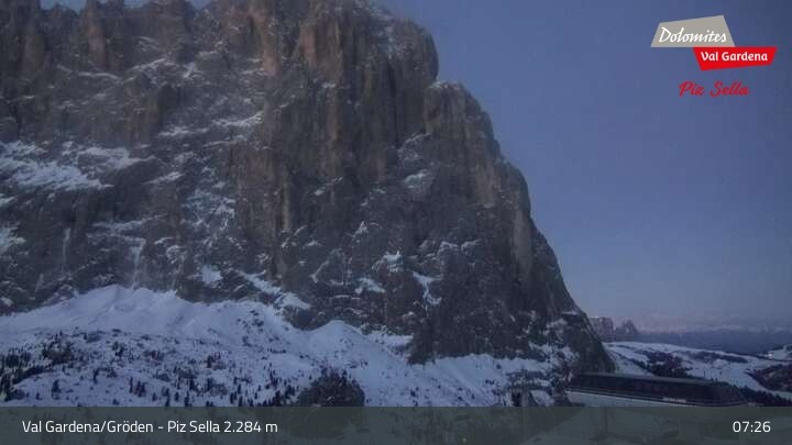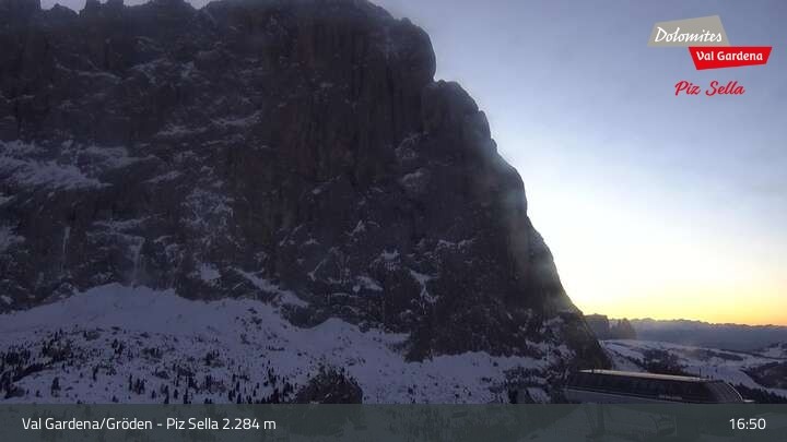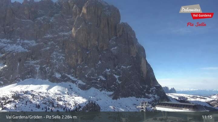 Ausblick von der Bergstation am Piz Sella in Val Gardena in Südirol. Zu sehen sind u.a. der Langkofel und die Sellagrupee.