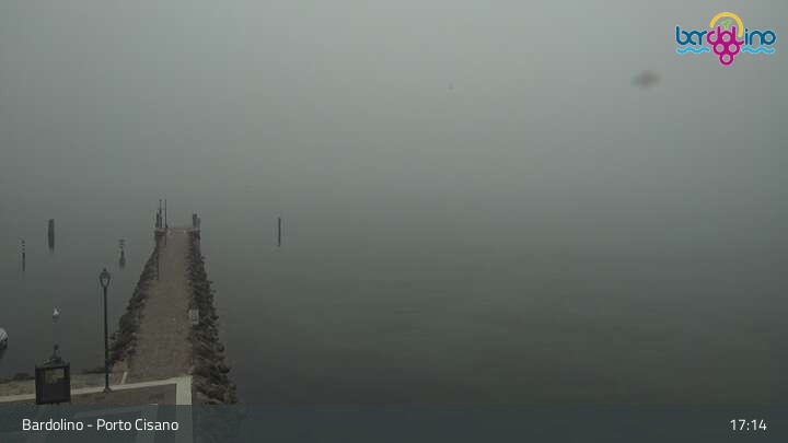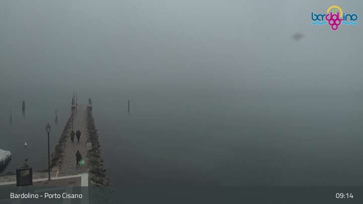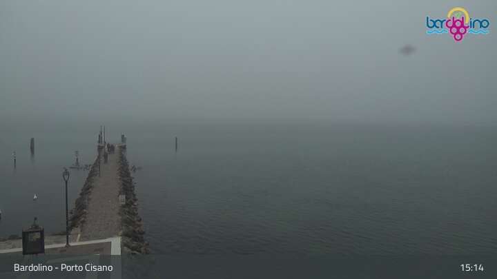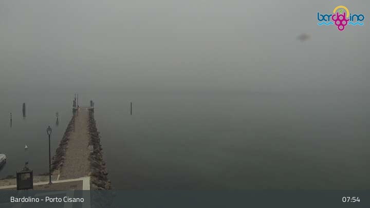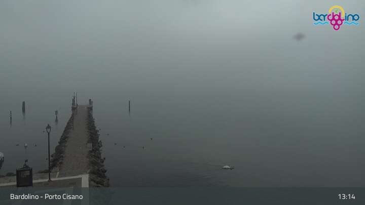 Die Kamera befindet sich am Strand Lido Mirabello und blickt nach Norden auf den Hafen von Bardolino am Gardasee.