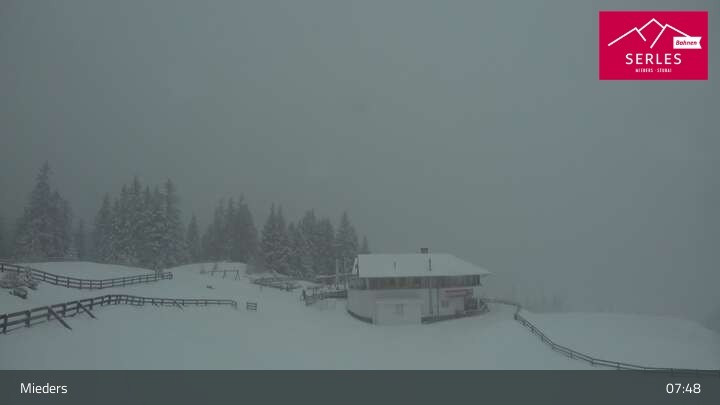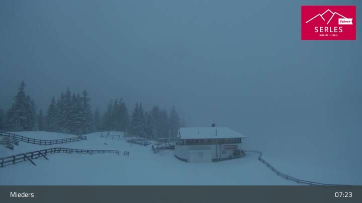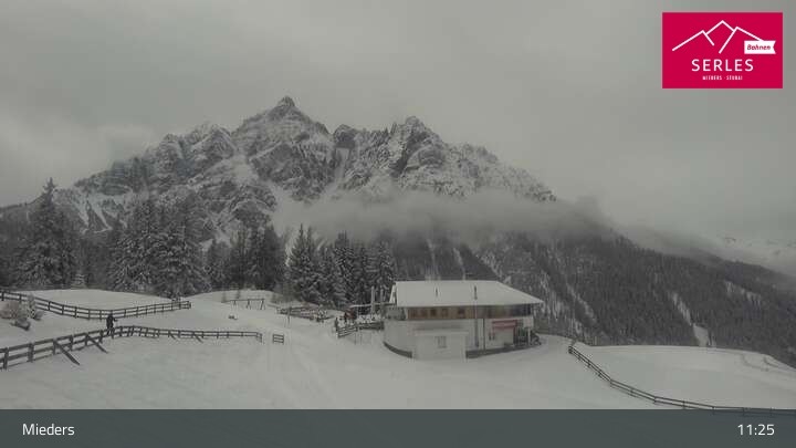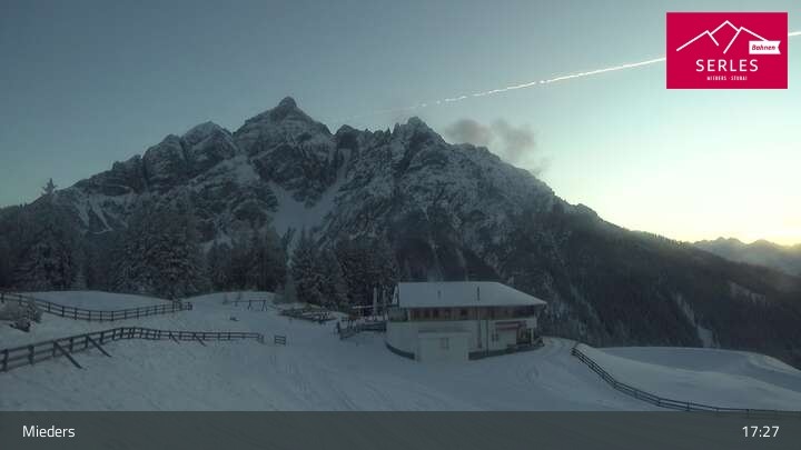 Die Webcam eröffnet den Blick von der Bergstation Koppeneck auf den Hausberg von Mieders, die Serles. Zu sehen sind außerdem das Bergrestaurant Koppeneck mit Kinderspielplatz und der Speichersee.