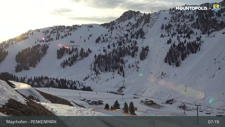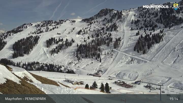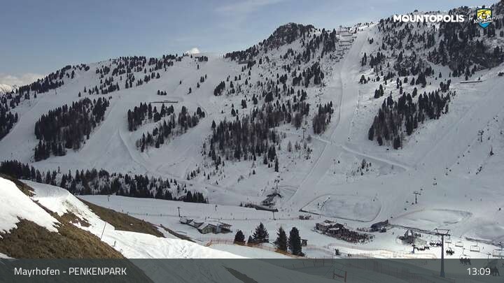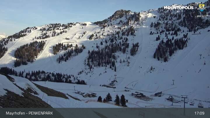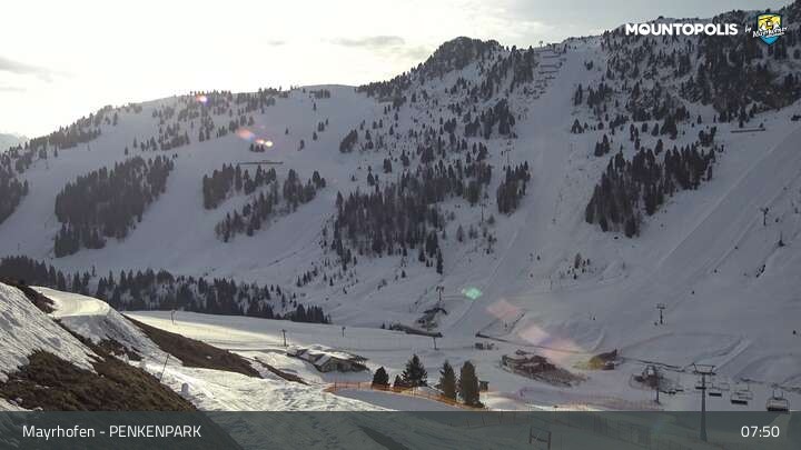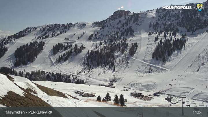 Hier blickst du auf den Vans Penken Park sowie den Sun-Jet Lift im Skigebiet Mayrhofen.