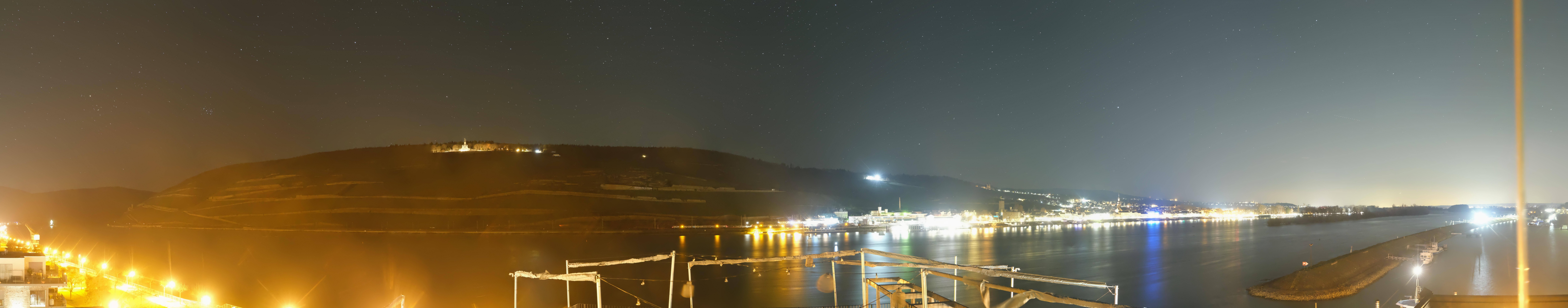 Panoramablick vom Dach des Hotels Papa Rhein in Bingen über den Rhein nach Rüdesheim. Zu sehen ist auch das Niederwalddenkmal und der Mäuseturm.